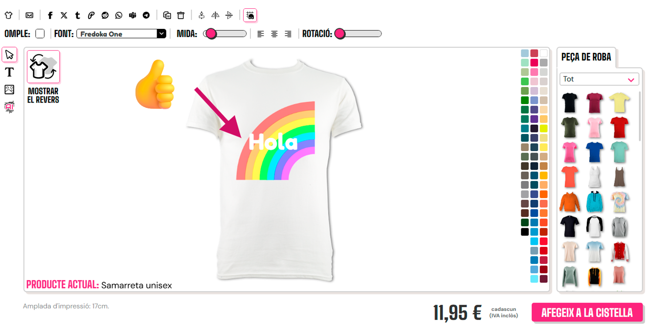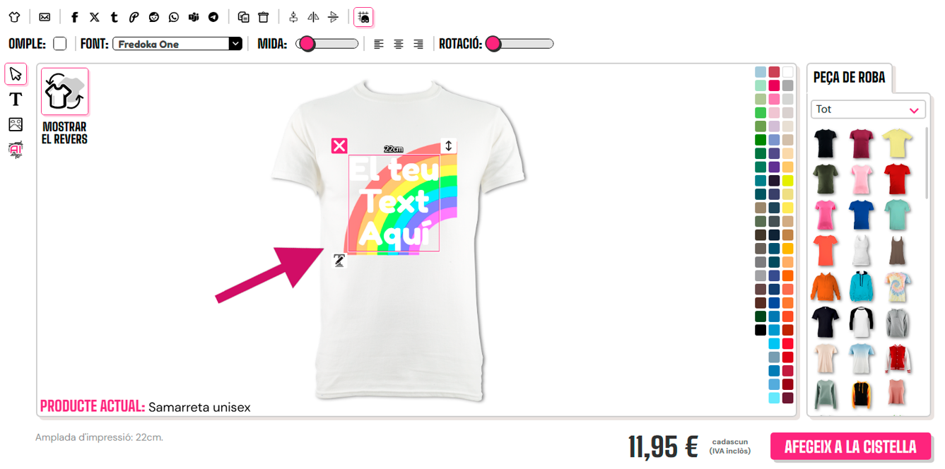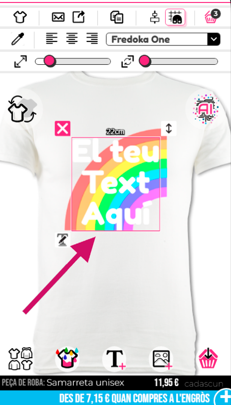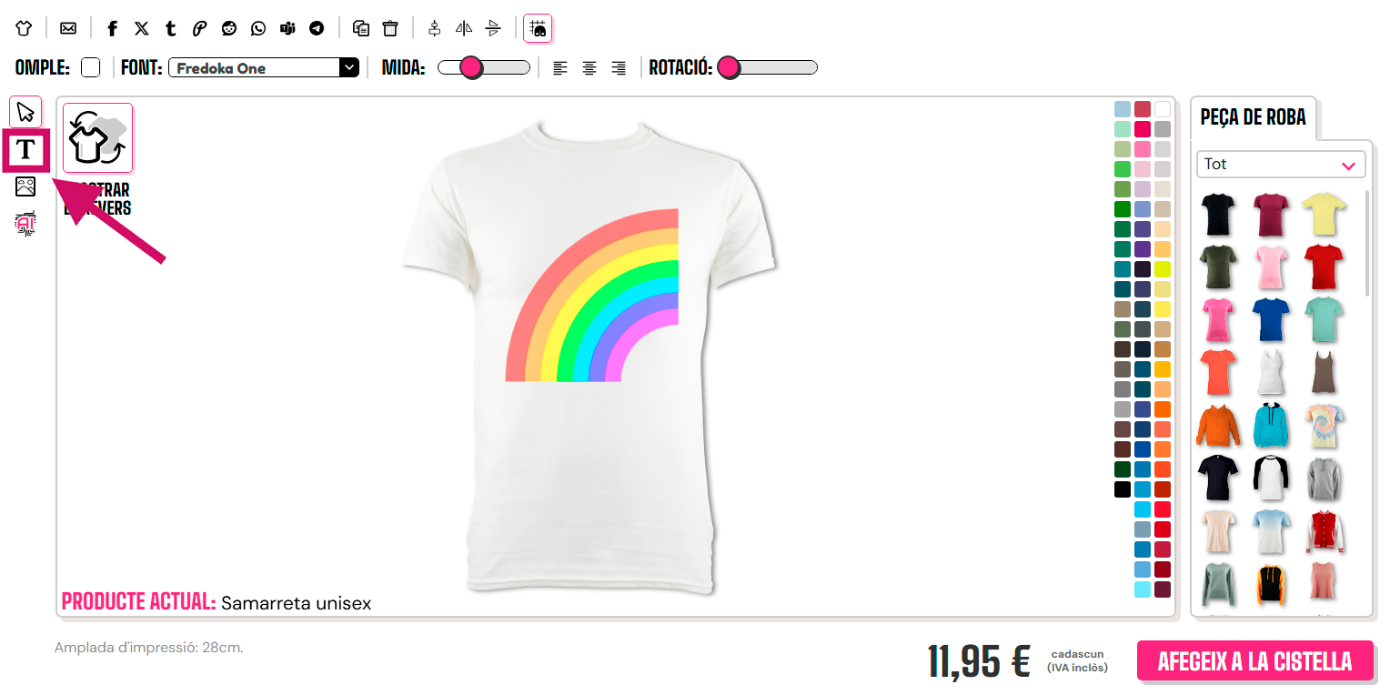 Per afegir text a la teva peça de roba, fes clic al símbol "T" al costat esquerre del dissenyador.