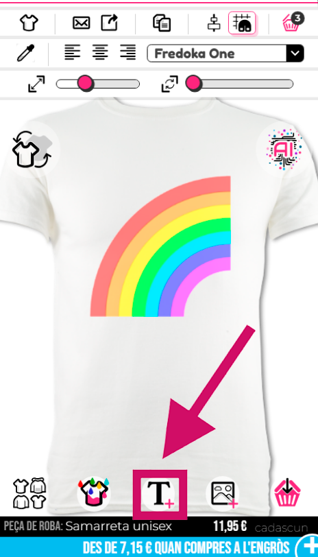Per afegir text a la teva peça de roba, fes clic al símbol "T+" a la part inferior del dissenyador.