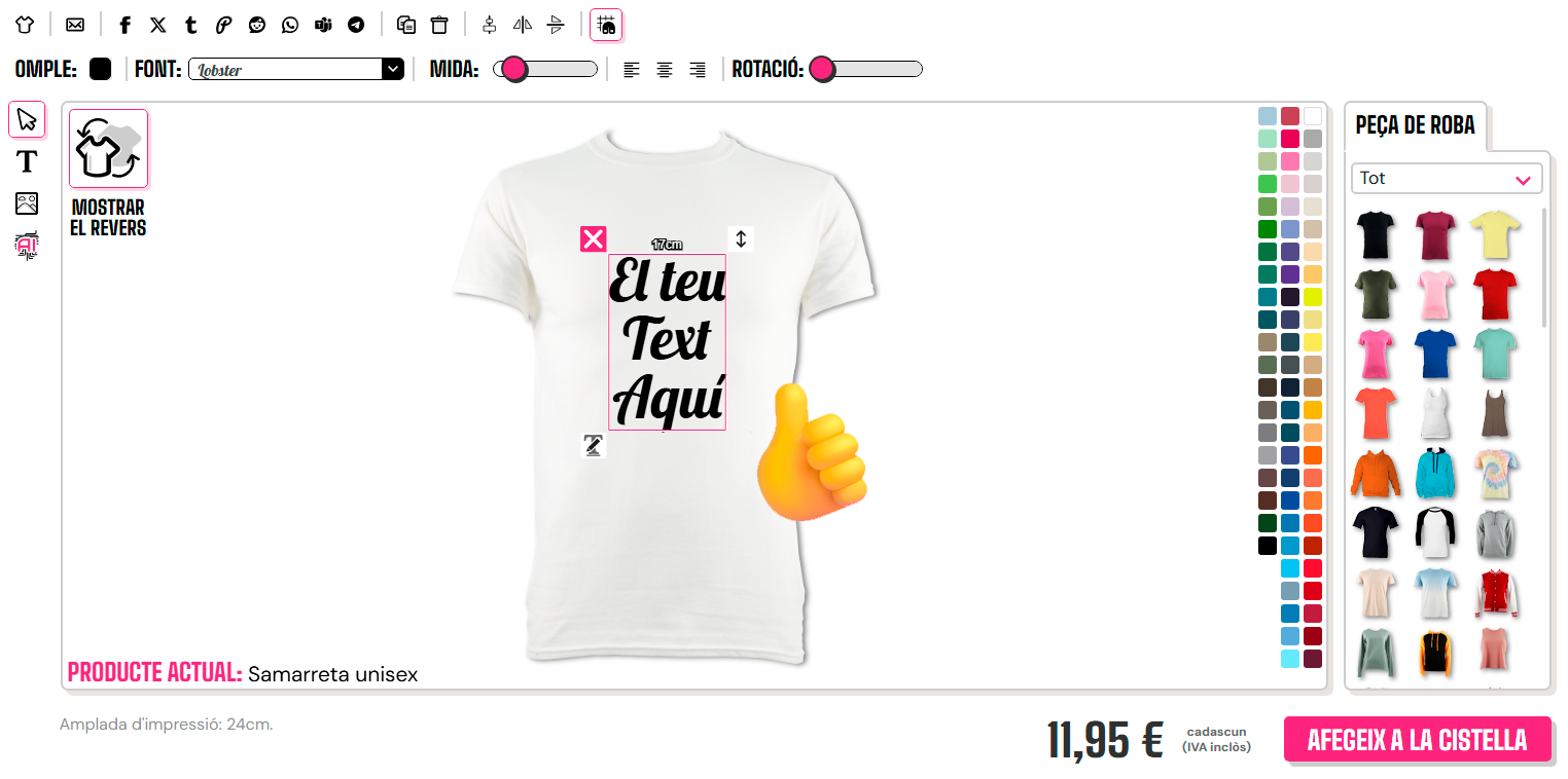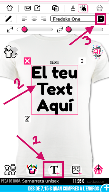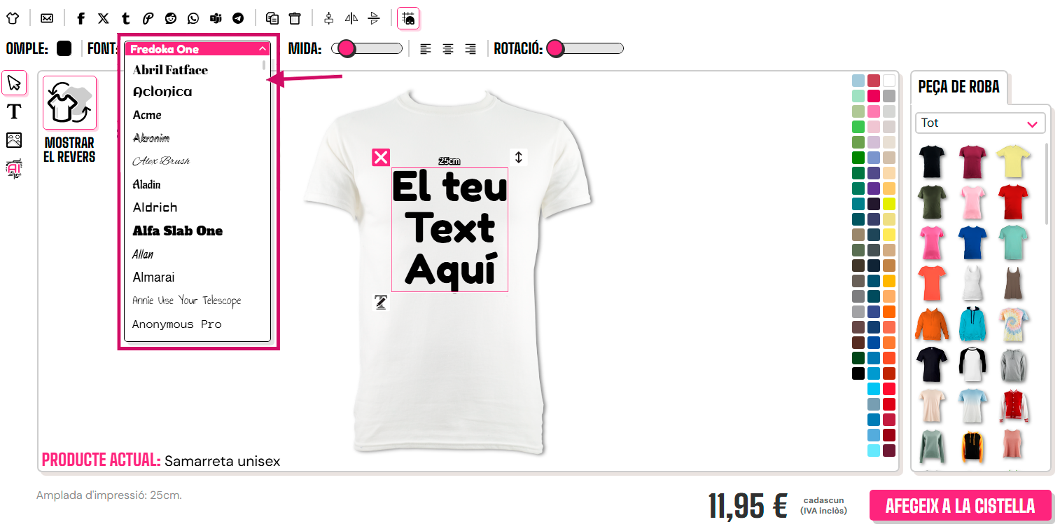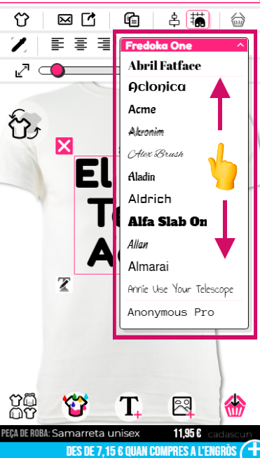 Per seleccionar un estil de lletra, hauràs de fer clic a la "T" a la part inferior del dissenyador per mostrar el text si encara no ho has fet, i després fer clic en aquest text per ressaltar la caixa. A continuació, hauràs de fer clic a la fletxa cap avall a la secció de fonts que es troba a la part superior del dissenyador. La font per defecte és "Fredoka One"