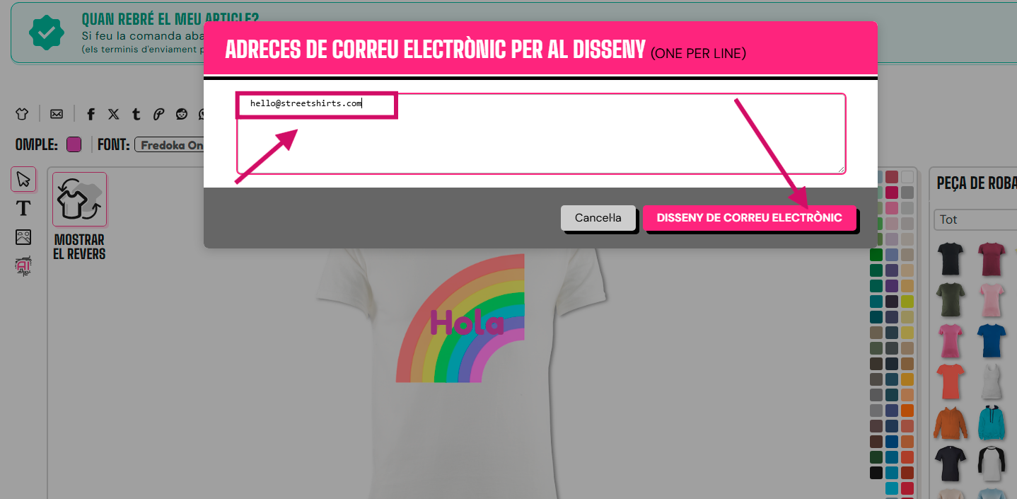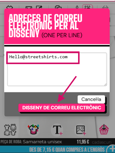Pots enviar-te'l per correu electrònic a tu mateix o fins i tot a un amic perquè el compri. Introdueix l'adreça de correu electrònic on vols guardar/enviar això i fes clic a "ENVIAR DISSENY"