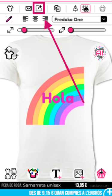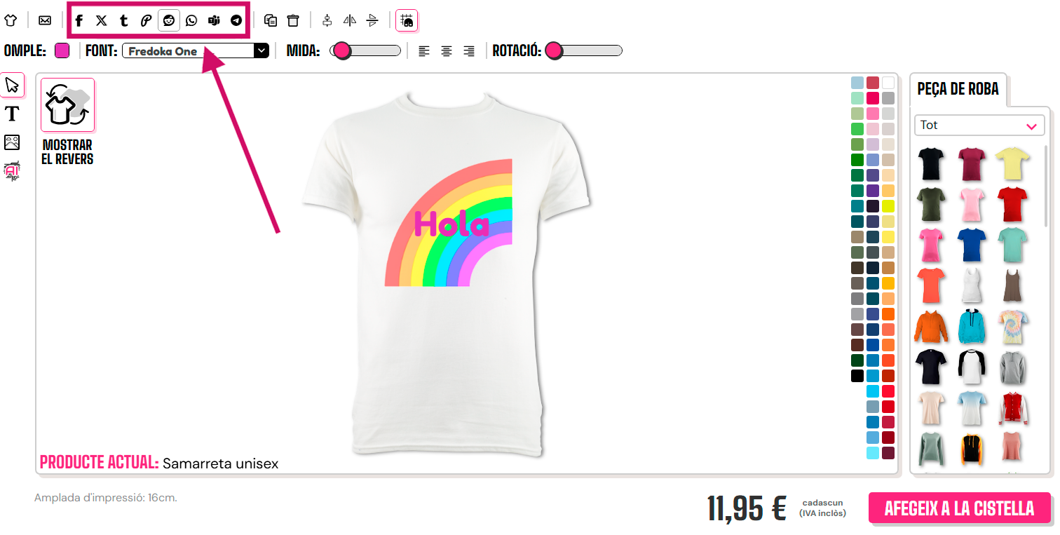 Per pujar els teus dissenys a les xarxes socials, hauràs de fer clic al botó de compartir (mostrat amb la fletxa a continuació) i després seleccionar la plataforma on vols compartir.