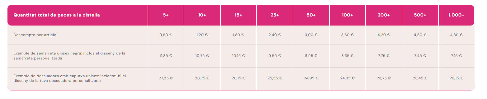 Els descomptes per comandes a l'engròs comencen a partir de 5 articles al cistell (poden ser de qualsevol mida, estil o color). Pots trobar la taula de descomptes per comandes a l'engròs sota el dissenyador a crear i comprar samarretes.