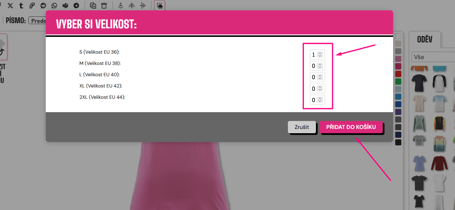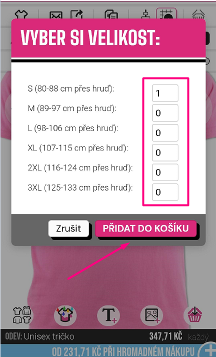 Vyberte požadovanou velikost zadáním potřebného počtu nebo stisknutím šipky nahoru (tato se objeví, když přejedete myší nad oblastí) pro uvedení množství.