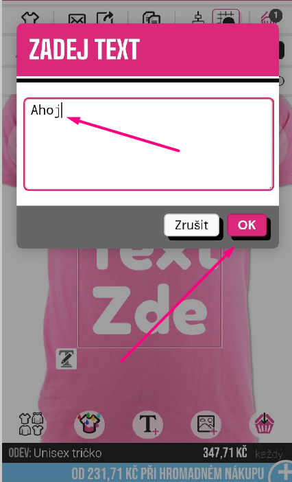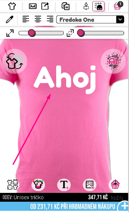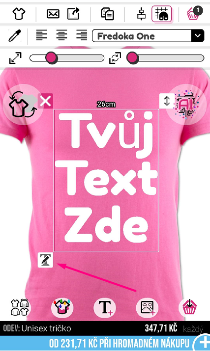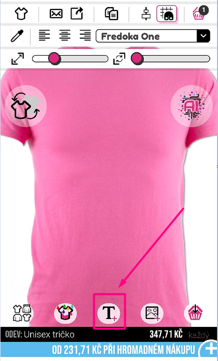 Pro přidání textu na váš oděv klikněte na symbol "T+" ve spodní části návrháře.