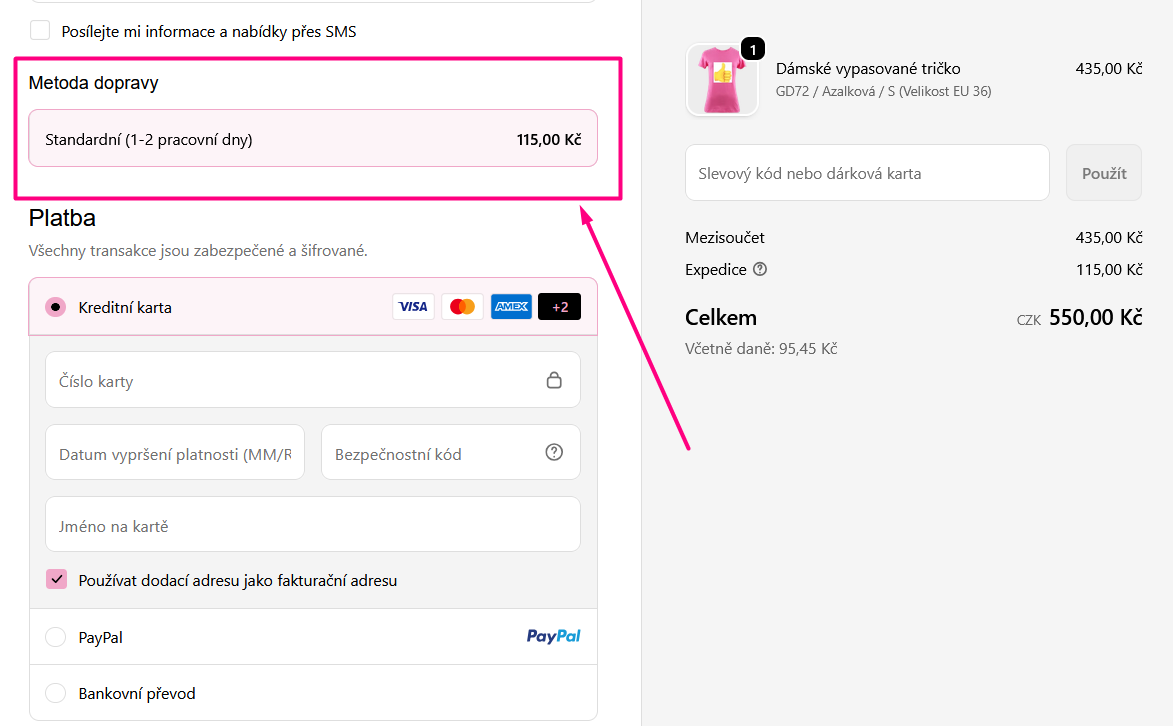 V případě, že tričko potřebujete doručit co nejdříve, zvolte možnost expresního doručení (pokud je k dispozici). Jakmile vyberete požadovaný způsob doručení, zobrazí se vám podrobný rozpis zvoleného doručení včetně cen za tuto službu. Úspěšně jste změnili způsob doručení.