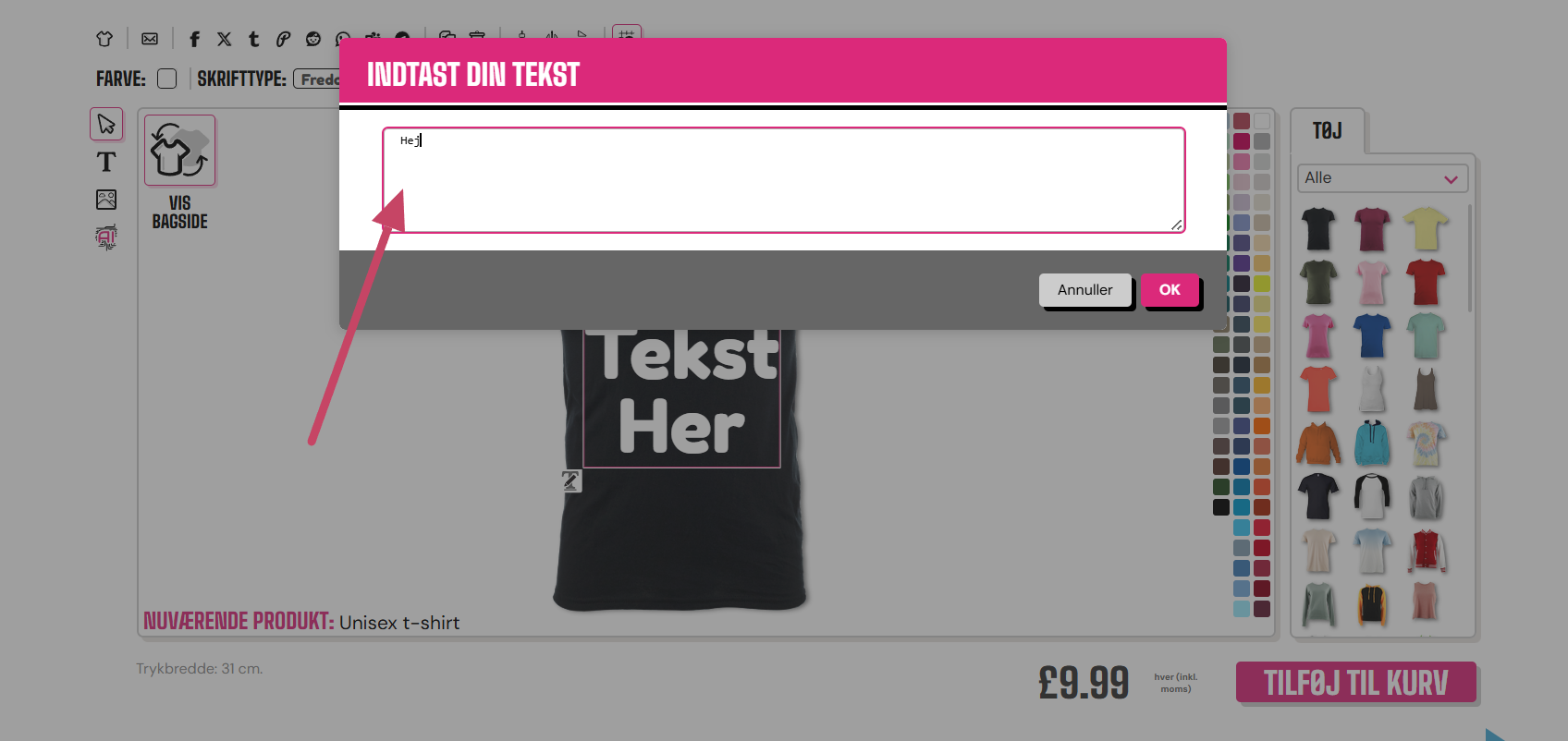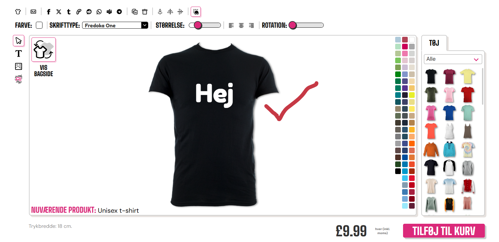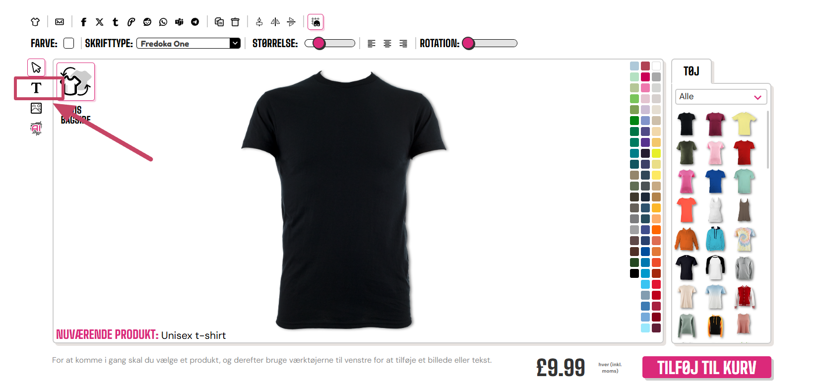 For at tilføje tekst på dit tøj skal du klikke på "T"-symbolet i venstre side af t-shirt-designeren.