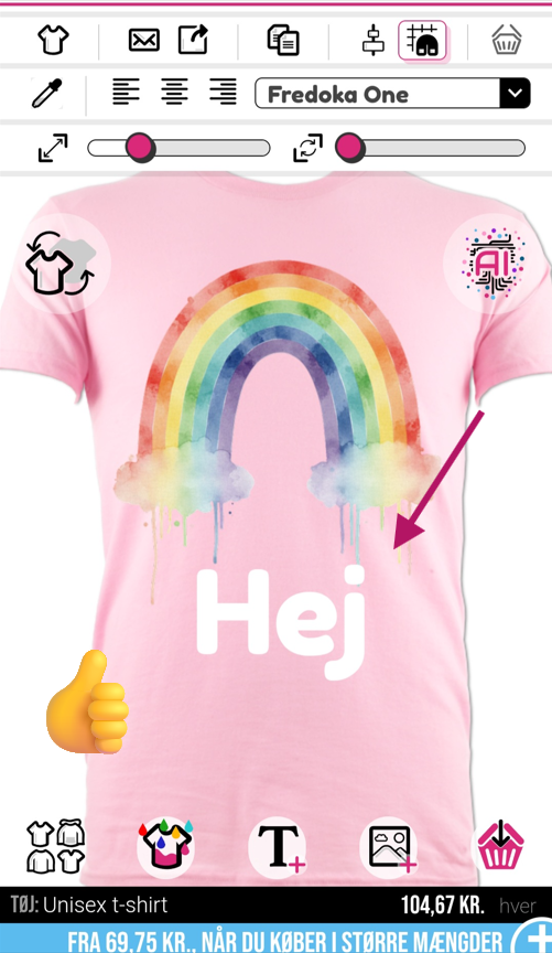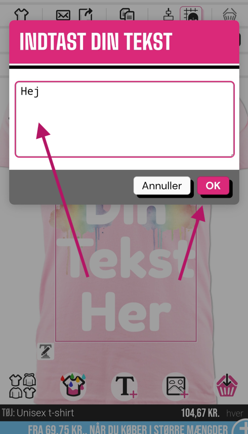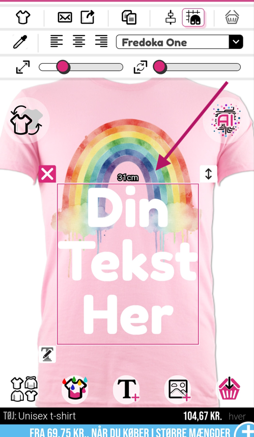 For at tilføje tekst på dit tøj, skal du klikke på "T+"-symbolet nederst i t-shirt-designeren.
