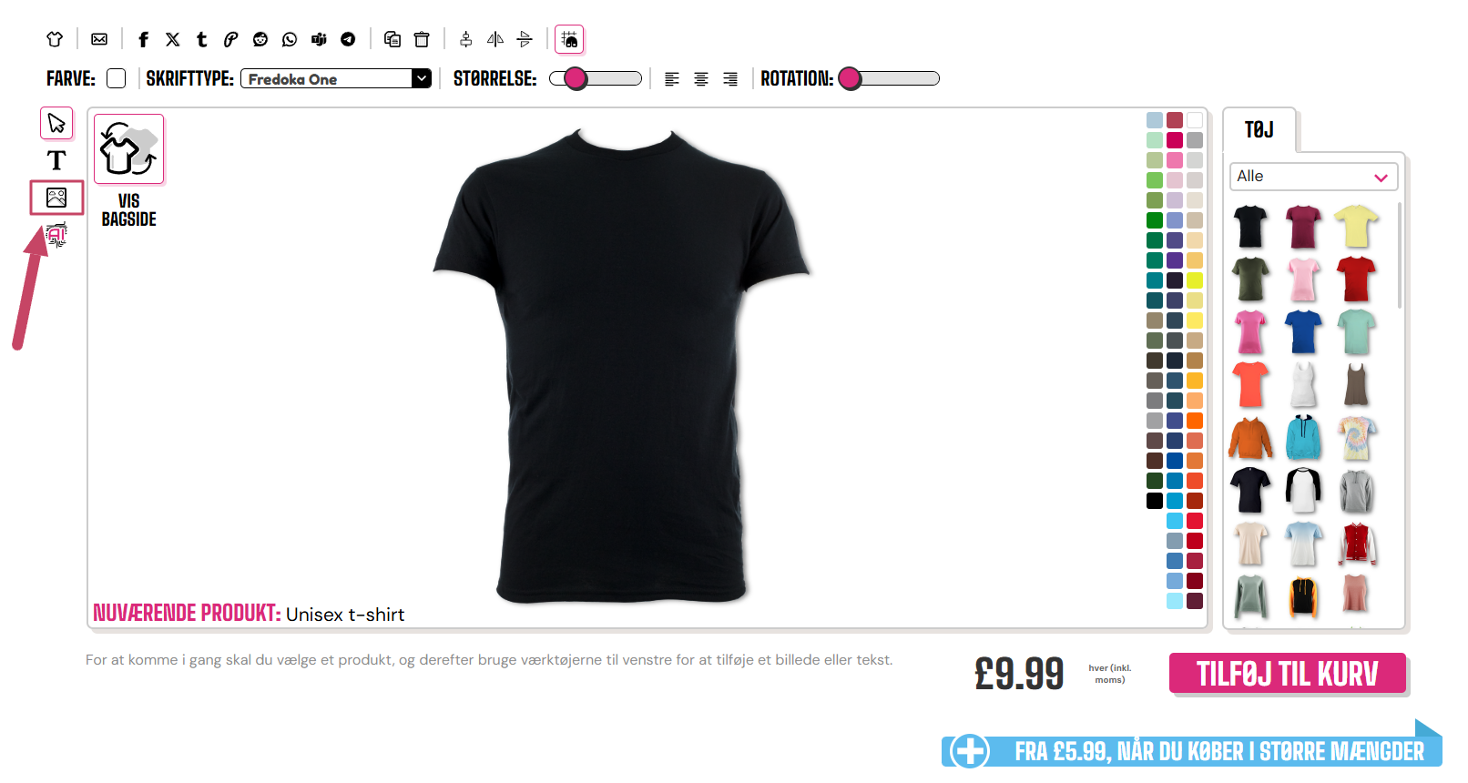 Hvis du vil tilføje billeder til dit tøj, skal du sikre dig, at de er i PNG- eller JPEG-format og er under 20 MB. Når du er klar til at uploade, skal du klikke på knappen tilføj billeder (denne ligner bakker og skyer og er placeret lige under "T" på venstre side af t-shirt-designeren).