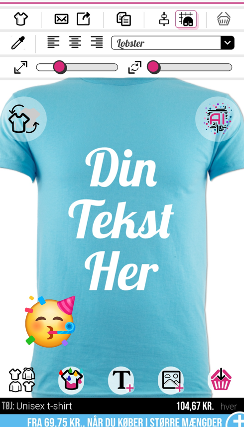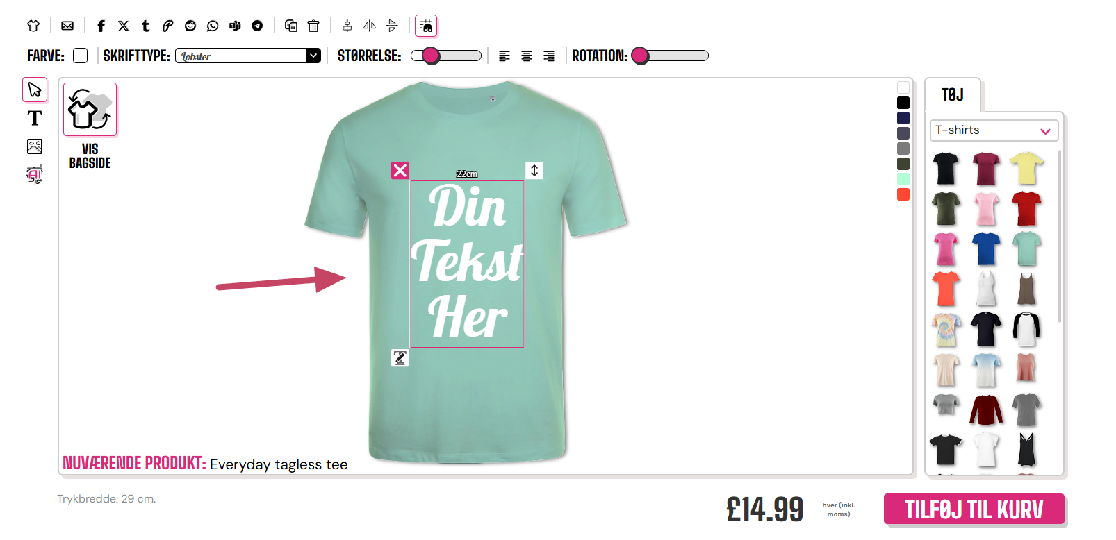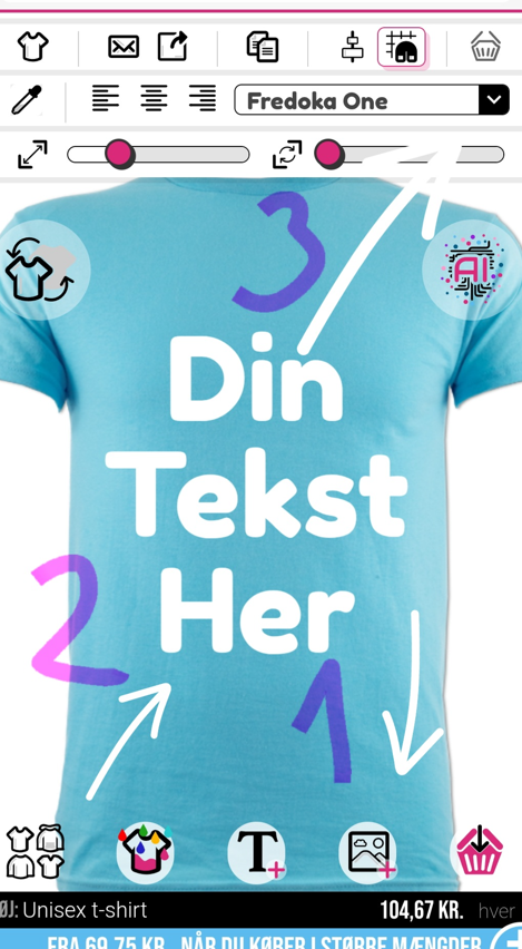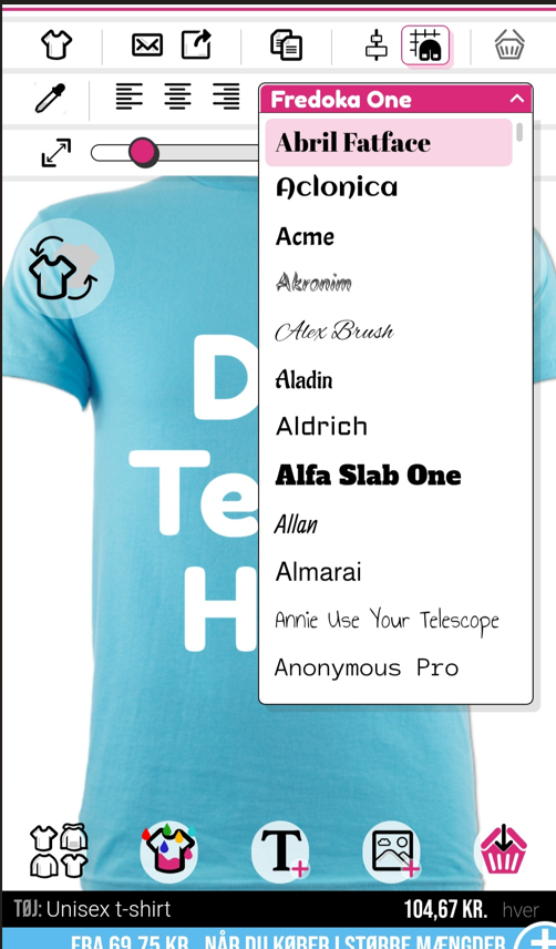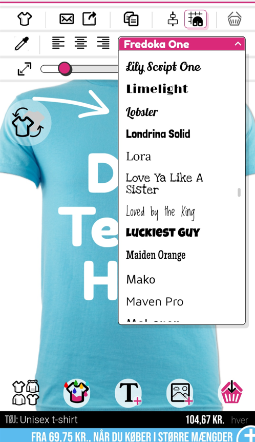 For at vælge en skrifttype skal du klikke på "T" nederst i designeren for at få teksten frem, hvis du ikke allerede har gjort det. Klik derefter på denne tekst for at få boksen til at blive markeret. Du skal dernæst klikke på den nedadvendte pil i skrifttypesektionen, som er placeret øverst i t-shirt-designeren. Standardskrifttypen er "Fredoka One"