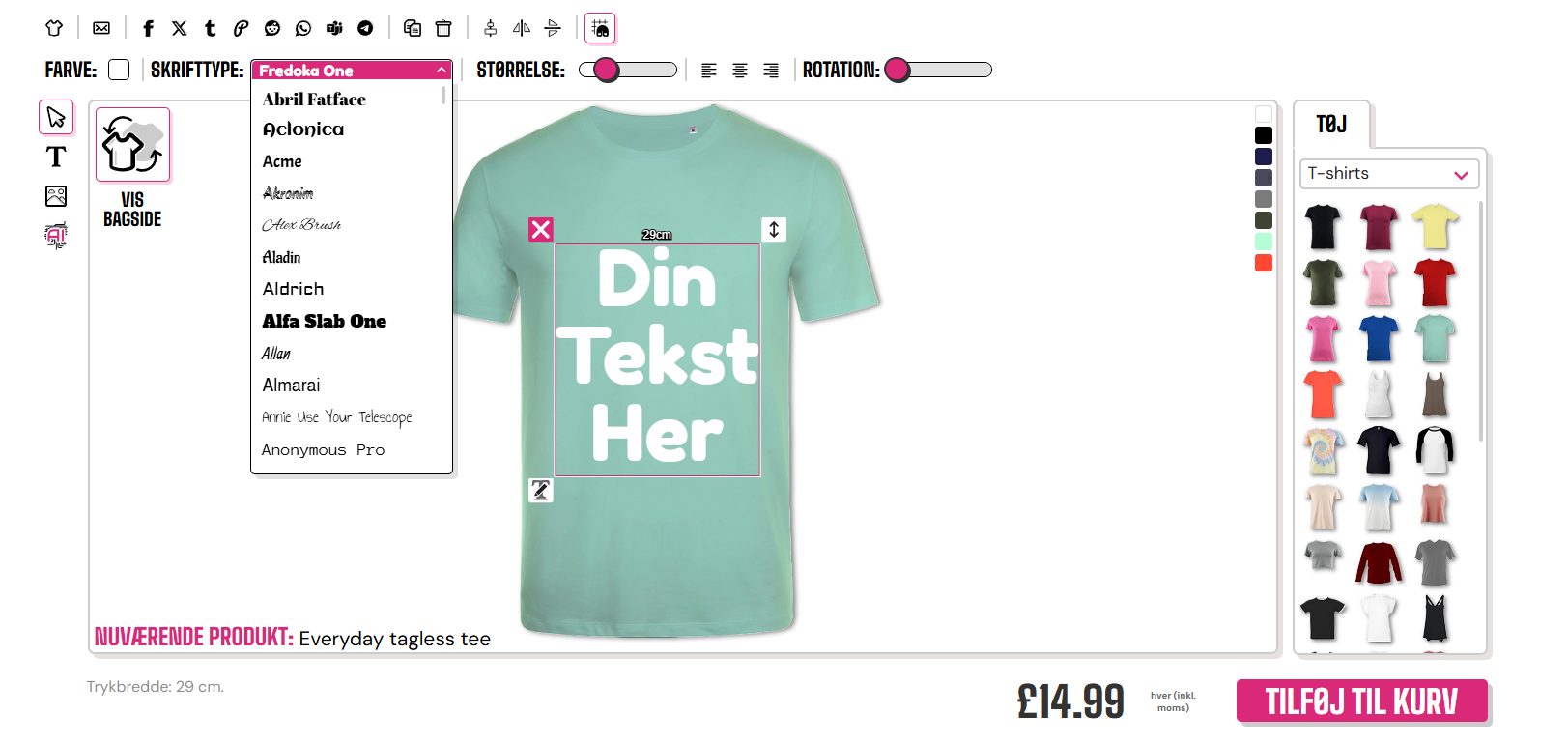 For at vælge en skrifttype skal du klikke på "T" i venstre side af t-shirt-designeren for at få teksten frem, hvis du ikke allerede har gjort det. Derefter skal du klikke på denne tekst for at få boksen til at blive markeret. Klik dernæst på den nedadvendte pil i skrifttypesektionen, som er placeret øverst i t-shirt-designeren. Standardskrifttypen er "Fredoka One"