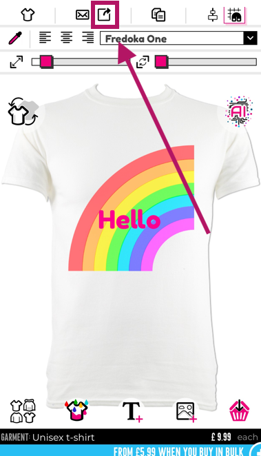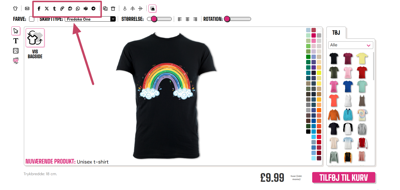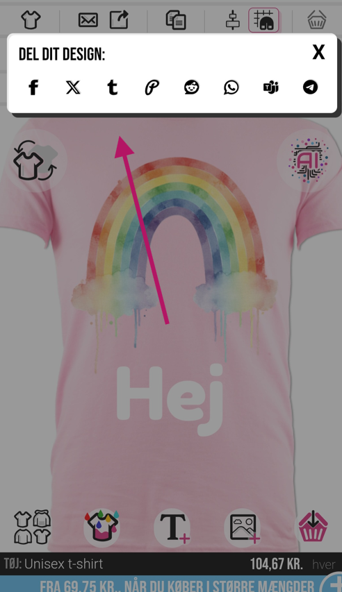 For at uploade dine designs til sociale medier skal du klikke på delingsknappen (vist med pilen nedenfor) og derefter vælge den platform, du ønsker at dele til.