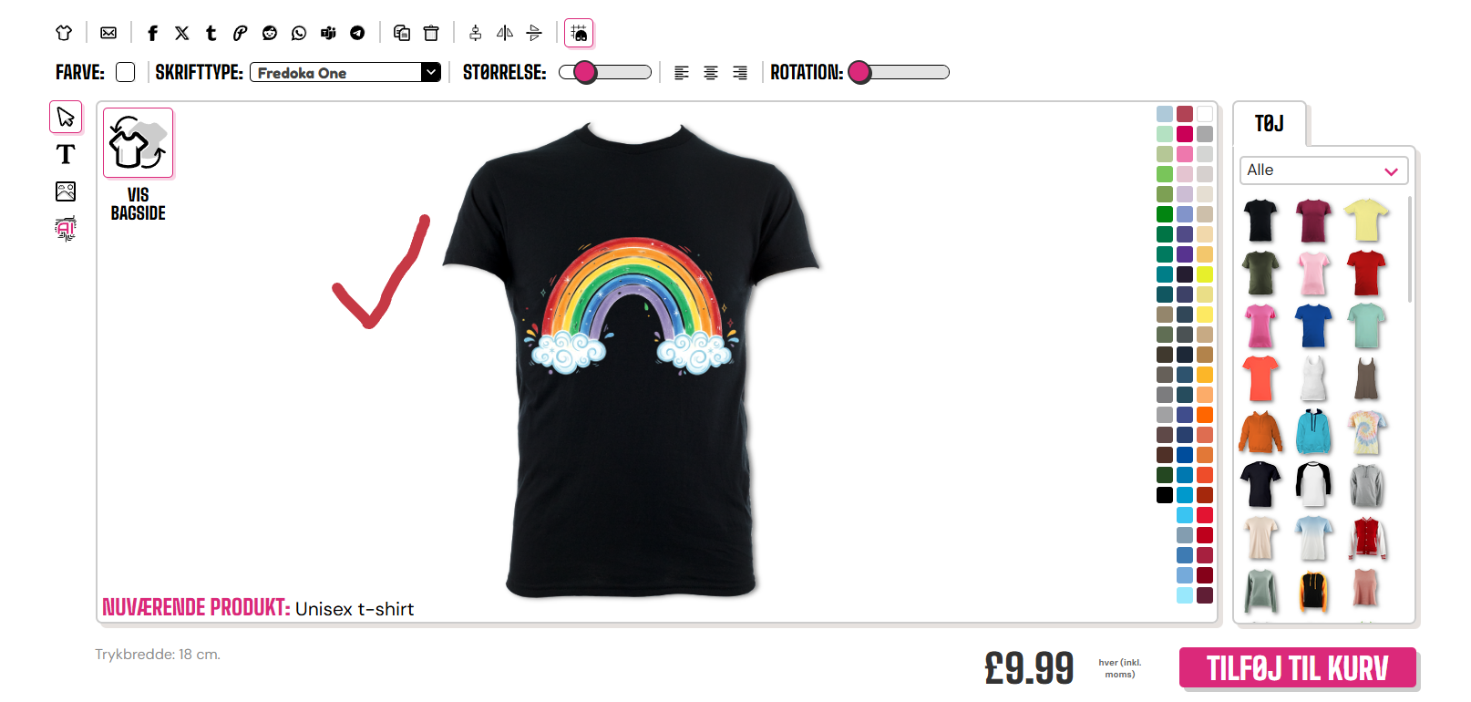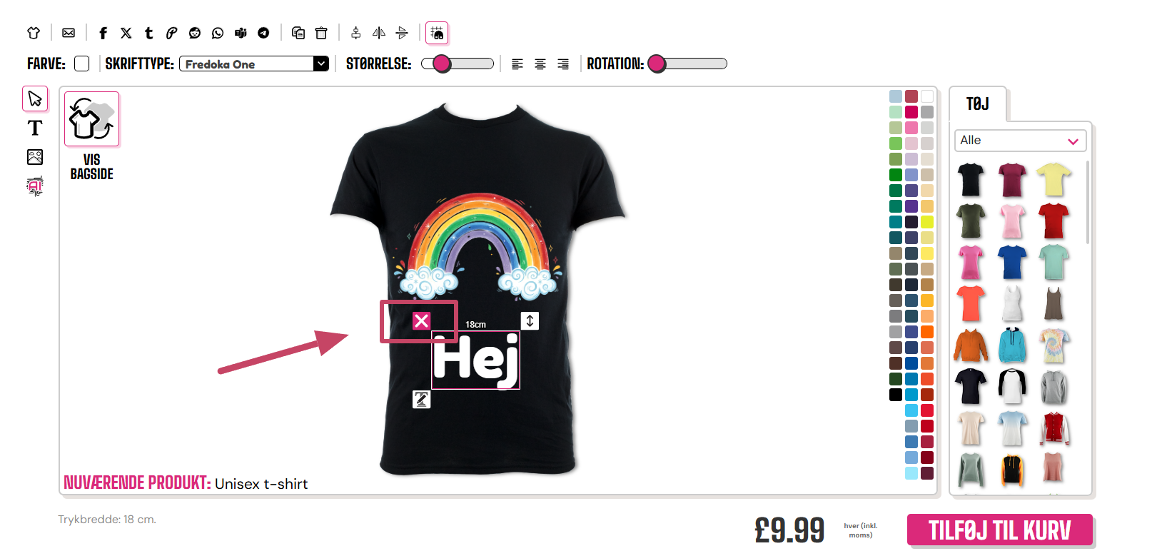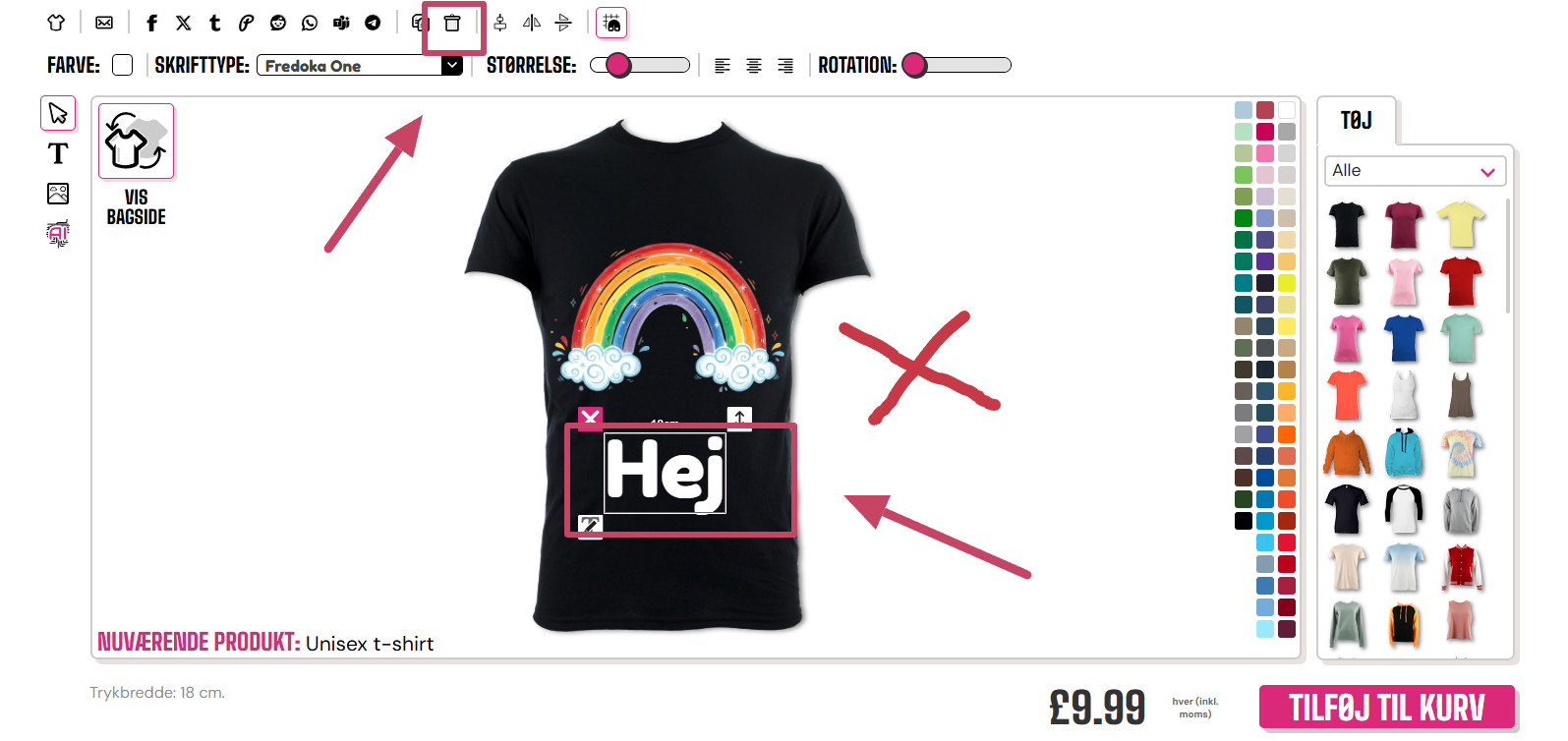 For at slette et uønsket billede eller tekst kan du klikke på skraldespanden øverst i t-shirt-designeren.
