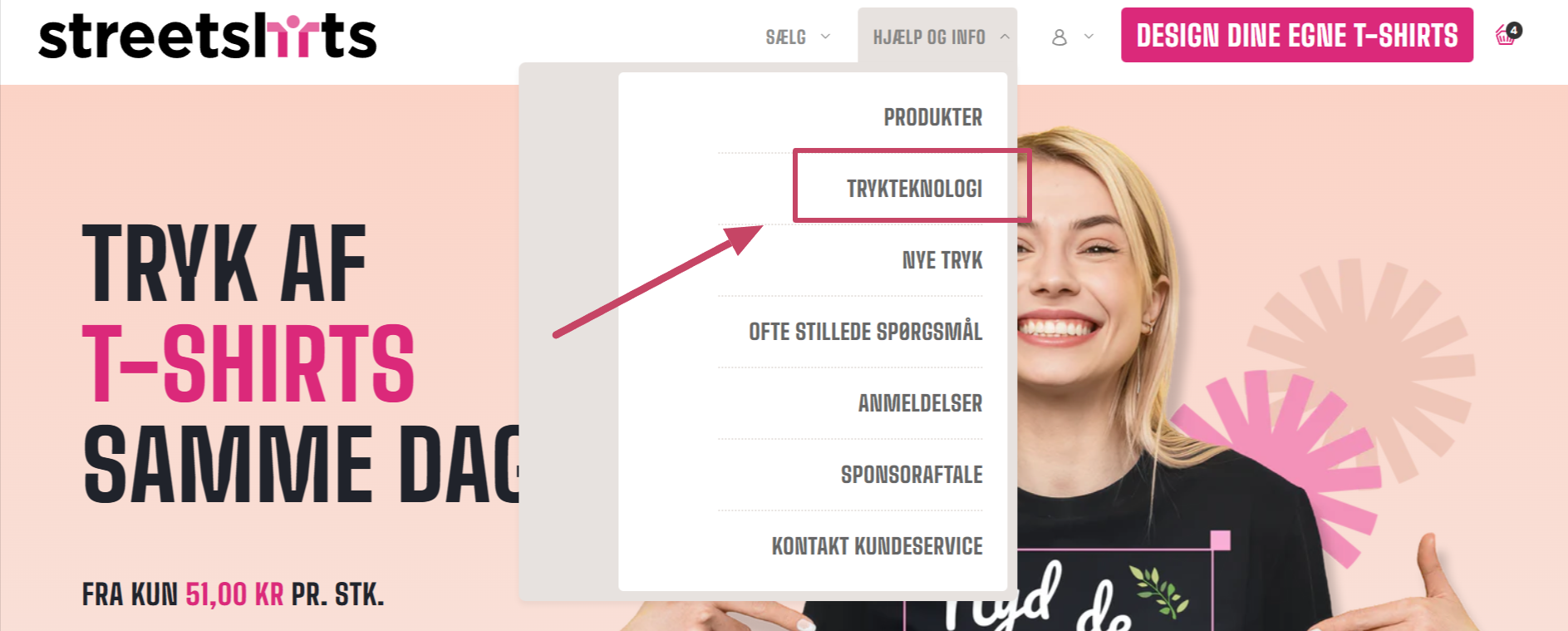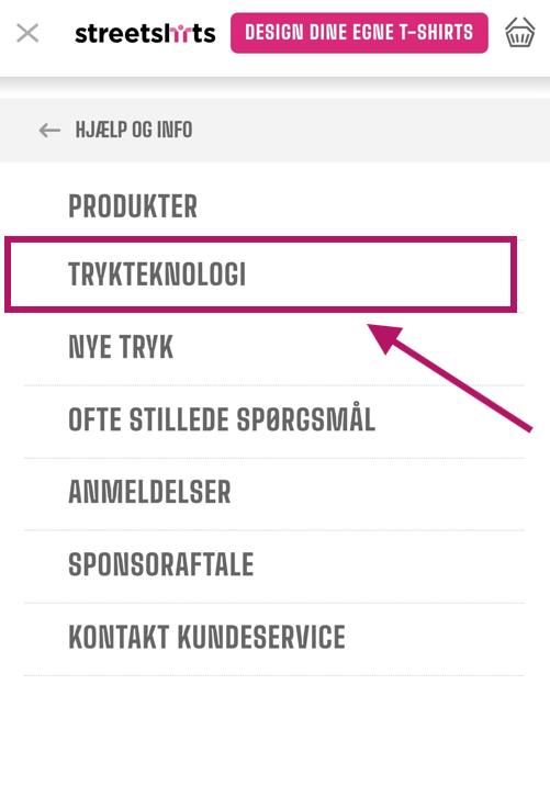 For at finde ud af mere om vores trykteknologi, gå til HJÆLP OG INFO øverst på skærmen og klik på "TRYKTEKNOLOGI"