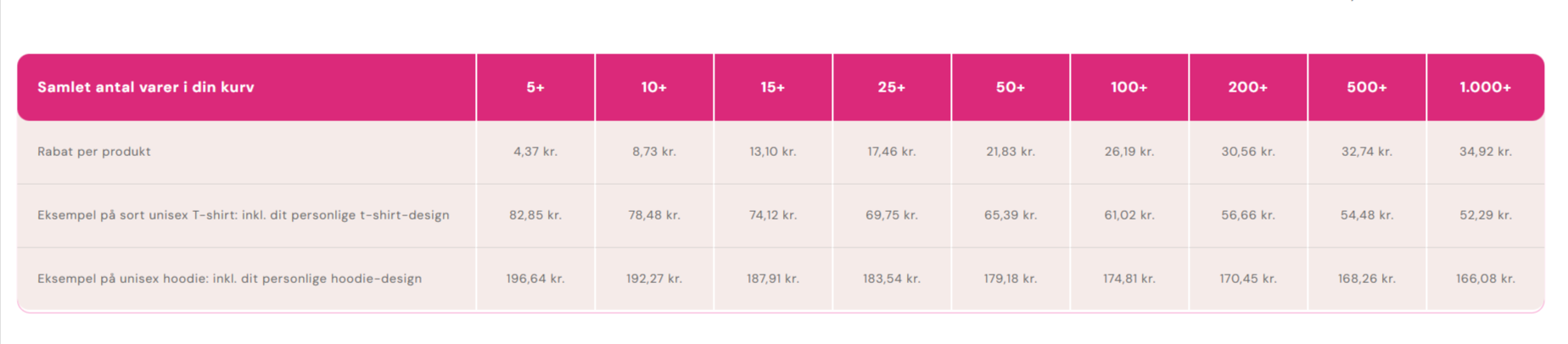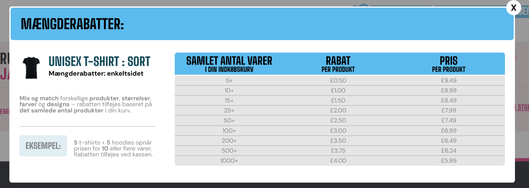 Rabatter på storkøb starter ved så lidt som 5 varer i din indkøbskurv (disse kan være i enhver størrelse, stil eller farve). Du kan finde rabattabellen for storkøb under t-shirt-designeren.