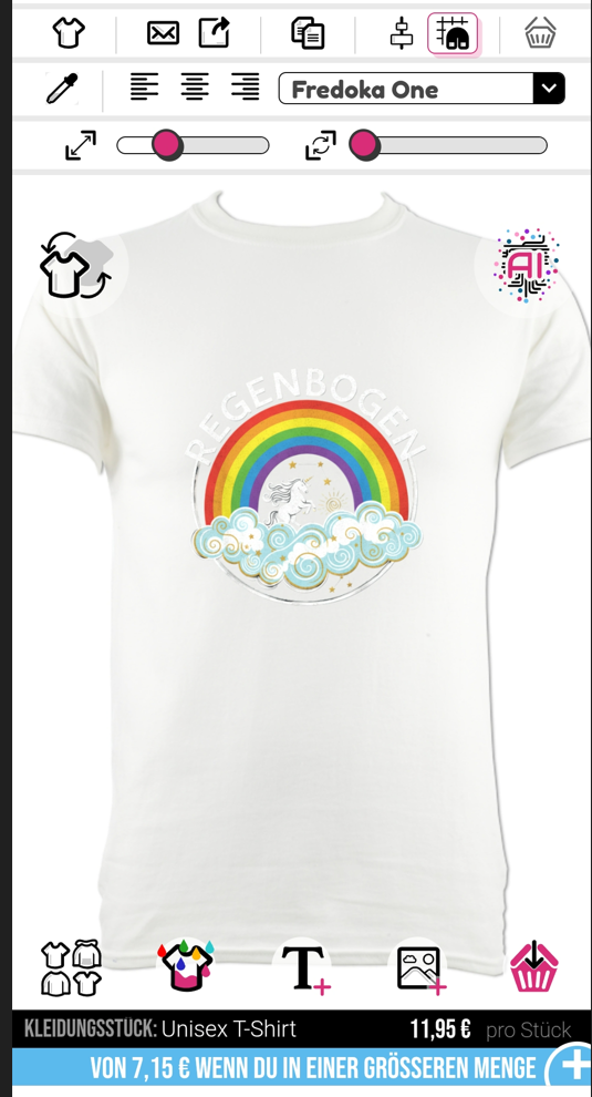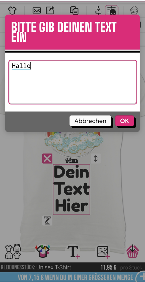 Um den Text zu Ihrem Oberteil am Handy hinzuzufügen, klicken Sie bitte auf das "T+"-Symbol unten im Designer.
