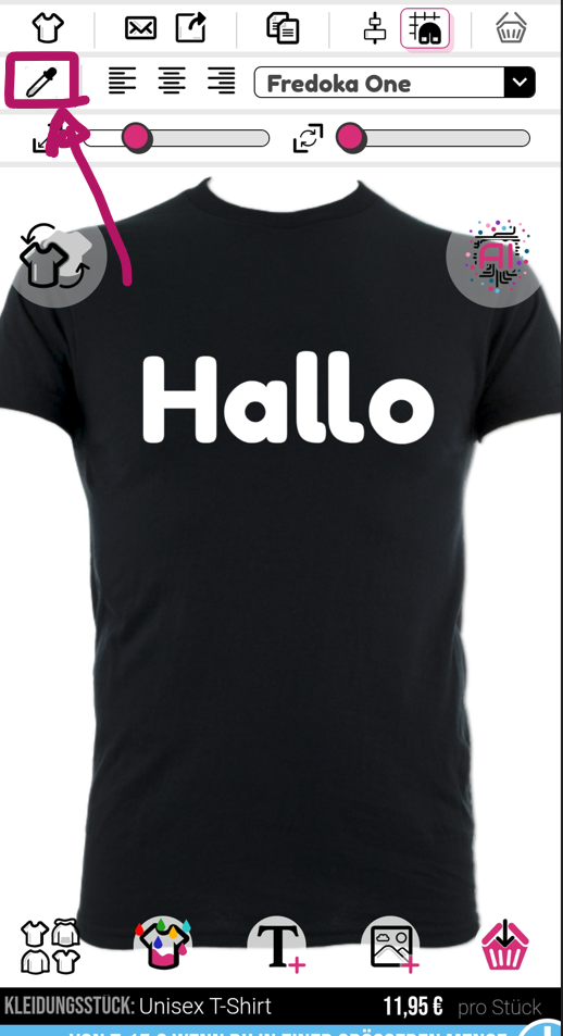 Wenn Sie die ausgewählte Textfarbe nicht möchten, müssen Sie auf Ihren Text klicken, um ihn zu markieren, sodass ein Rahmen darum erscheint. Dann müssen Sie oben links im Designer auf das Augentropfersymbol oben links klicken.