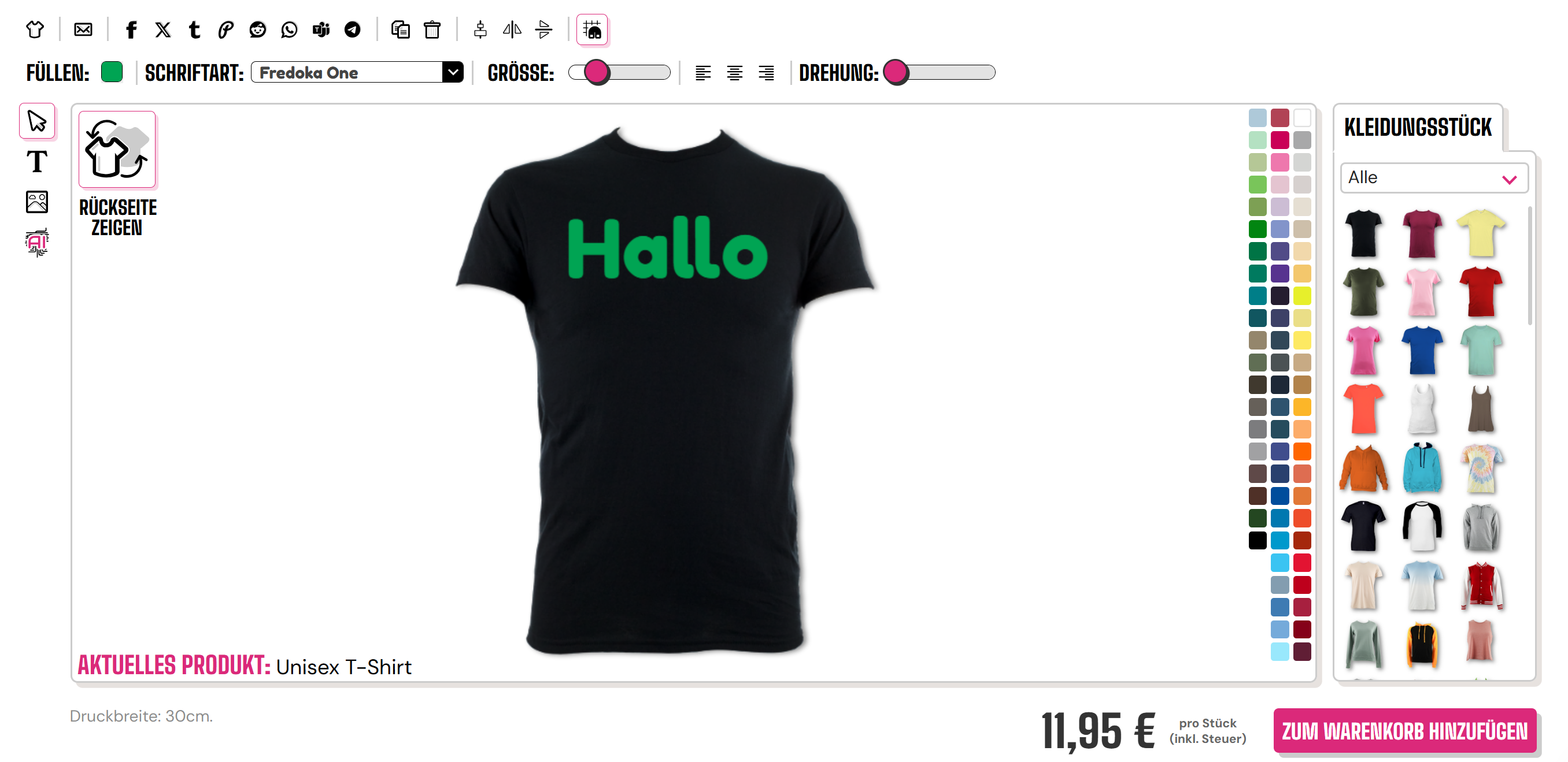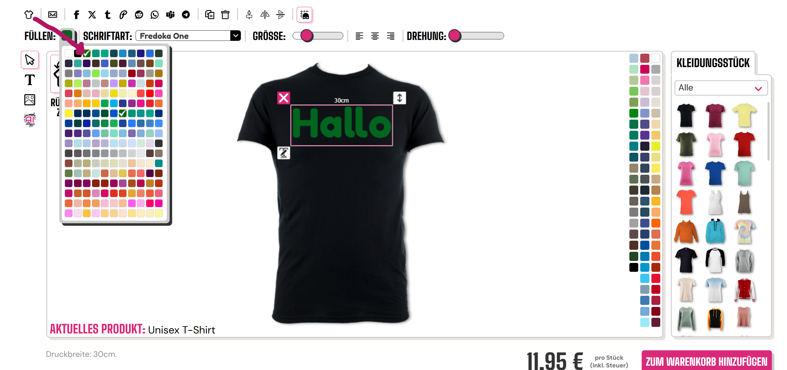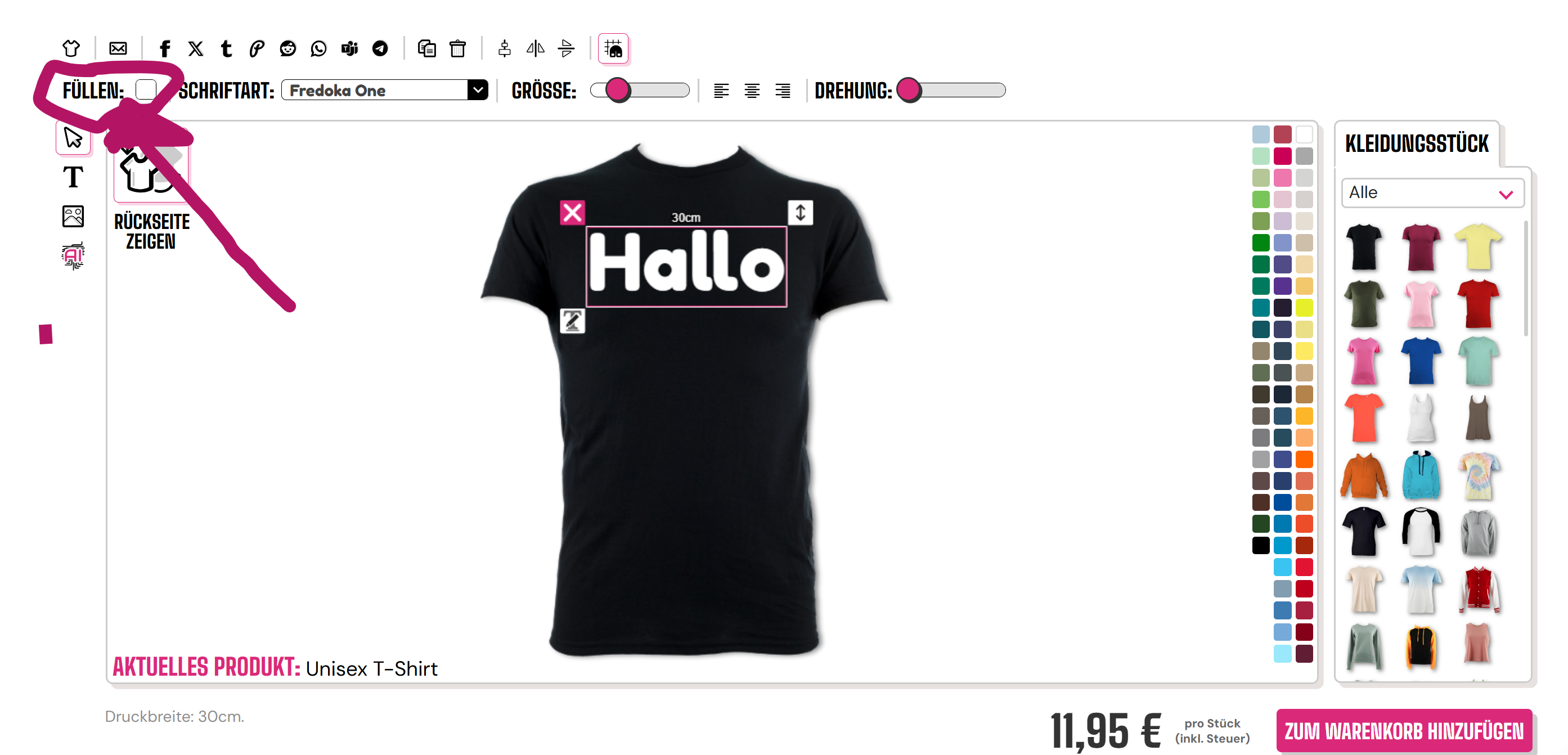 Wenn Sie die ausgewählte Textfarbe nicht möchten, müssen Sie auf Ihren Text klicken, um ihn zu markieren, sodass ein Rahmen darum erscheint. Dann müssen Sie oben links im Designer auf "Füllen" klicken.