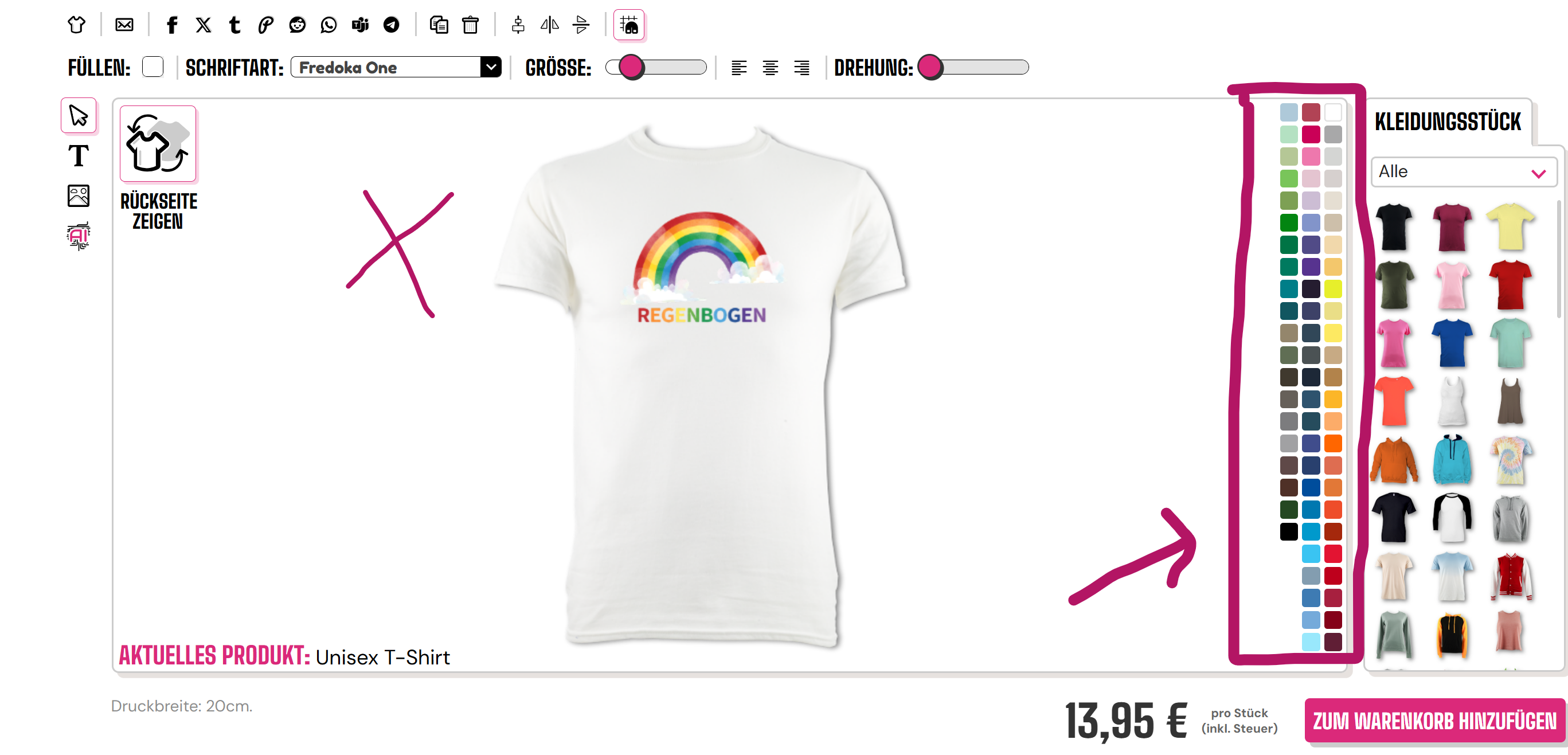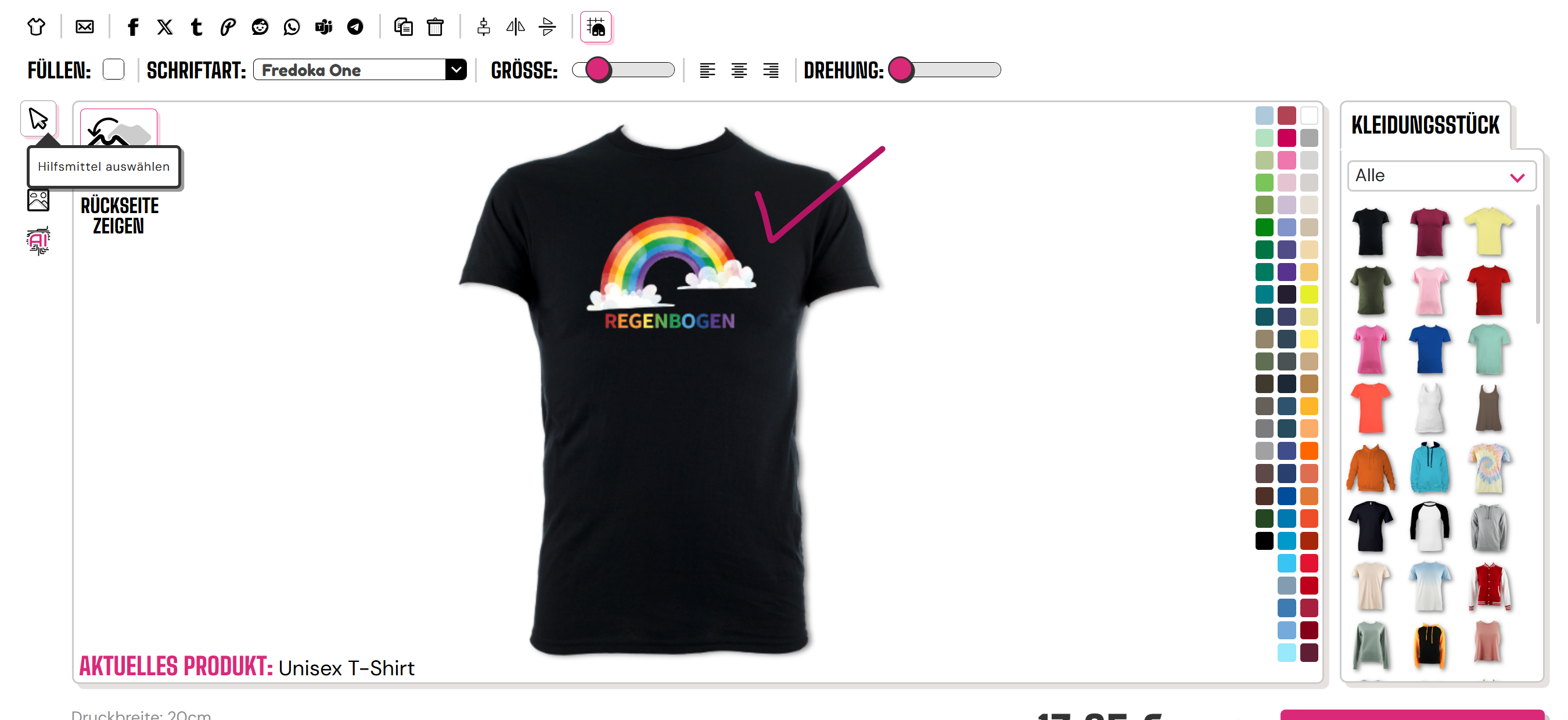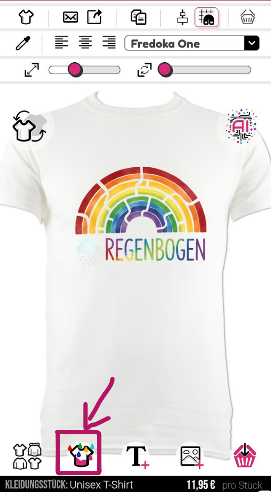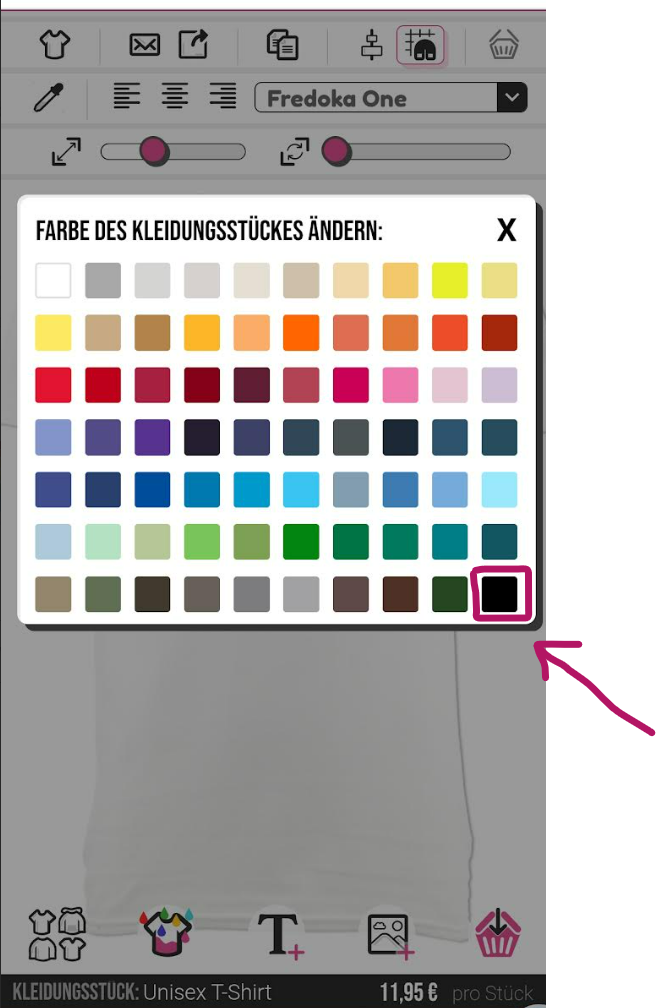 Um die Farbe Ihres Kleidungsstücks am Handy zu ändern, müssen Sie den T-Shirt-Farbwähler unten im Designer auswählen.