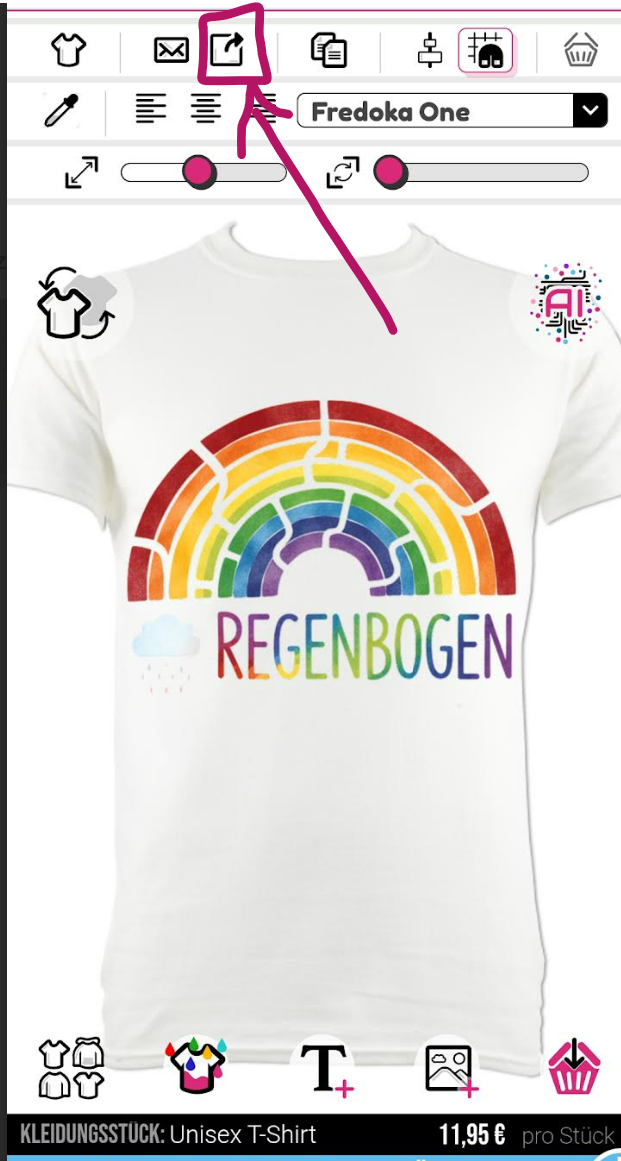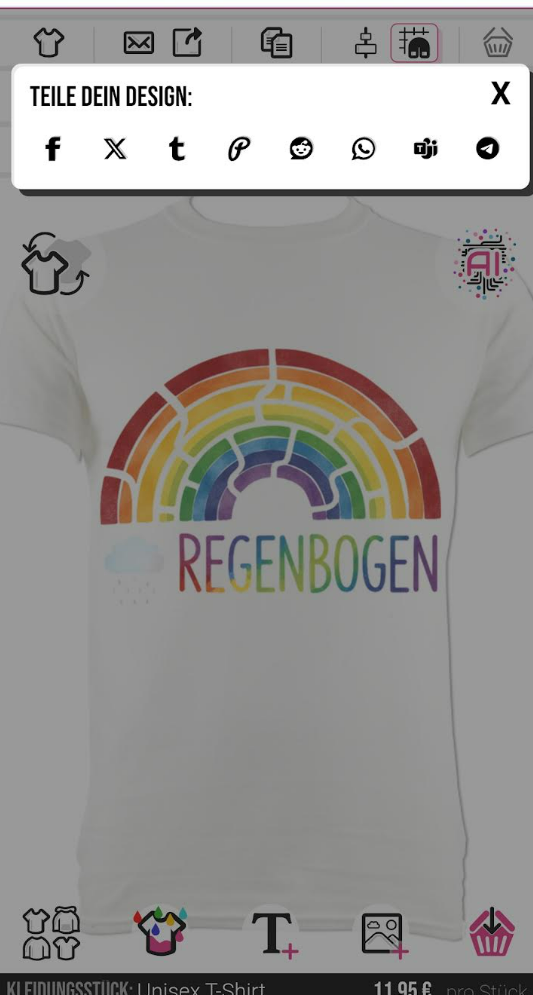 Um Ihre Designs am Handy in sozialen Medien hochzuladen, müssen Sie auf die Teilen-Schaltfläche klicken (unten mit dem Pfeil angezeigt) und dann die Plattform auswählen, auf der Sie teilen möchten.