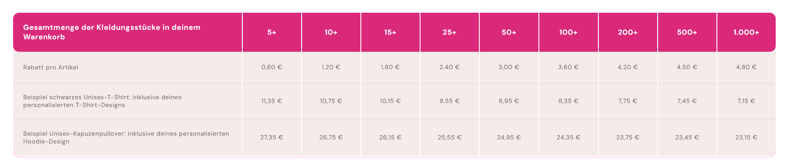 Rabatte für Großbestellungen beginnen bereits ab 5 Artikeln in Ihrem Warenkorb (diese können jede Größe, Stil oder Farbe haben). Sie finden die Rabattstaffel für Großbestellungen unter dem Designer beim Erstellen und Kaufen von T-Shirts.