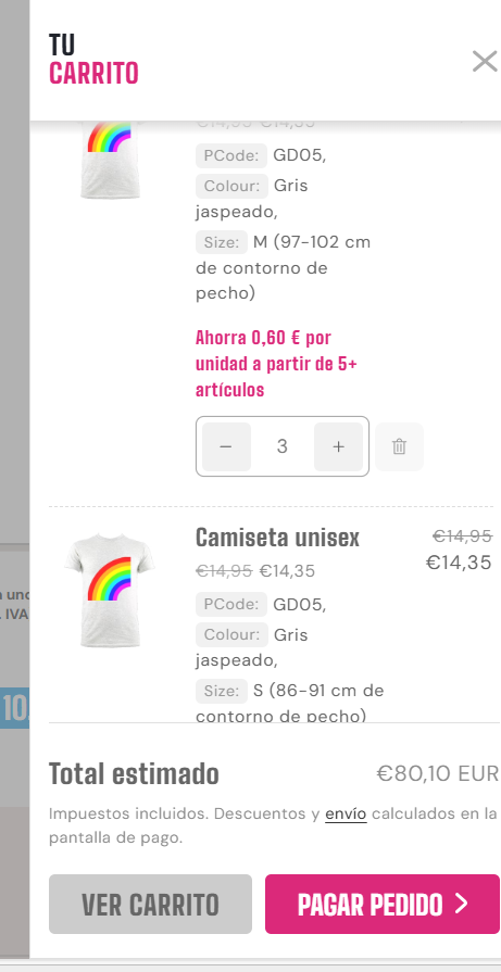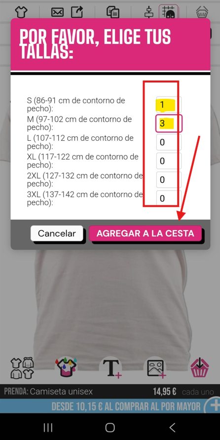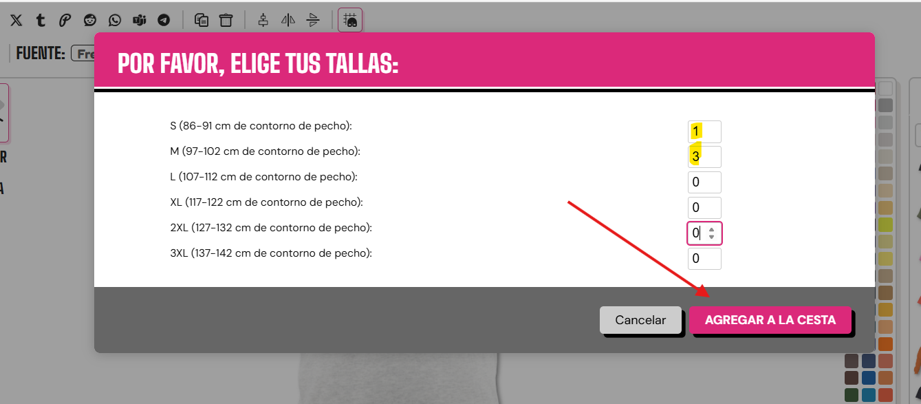 Elige la talla que deseas ingresando el número requerido o presionando la flecha hacia arriba (esto aparecerá cuando pases el ratón sobre el área) para aumentar la cantidad.