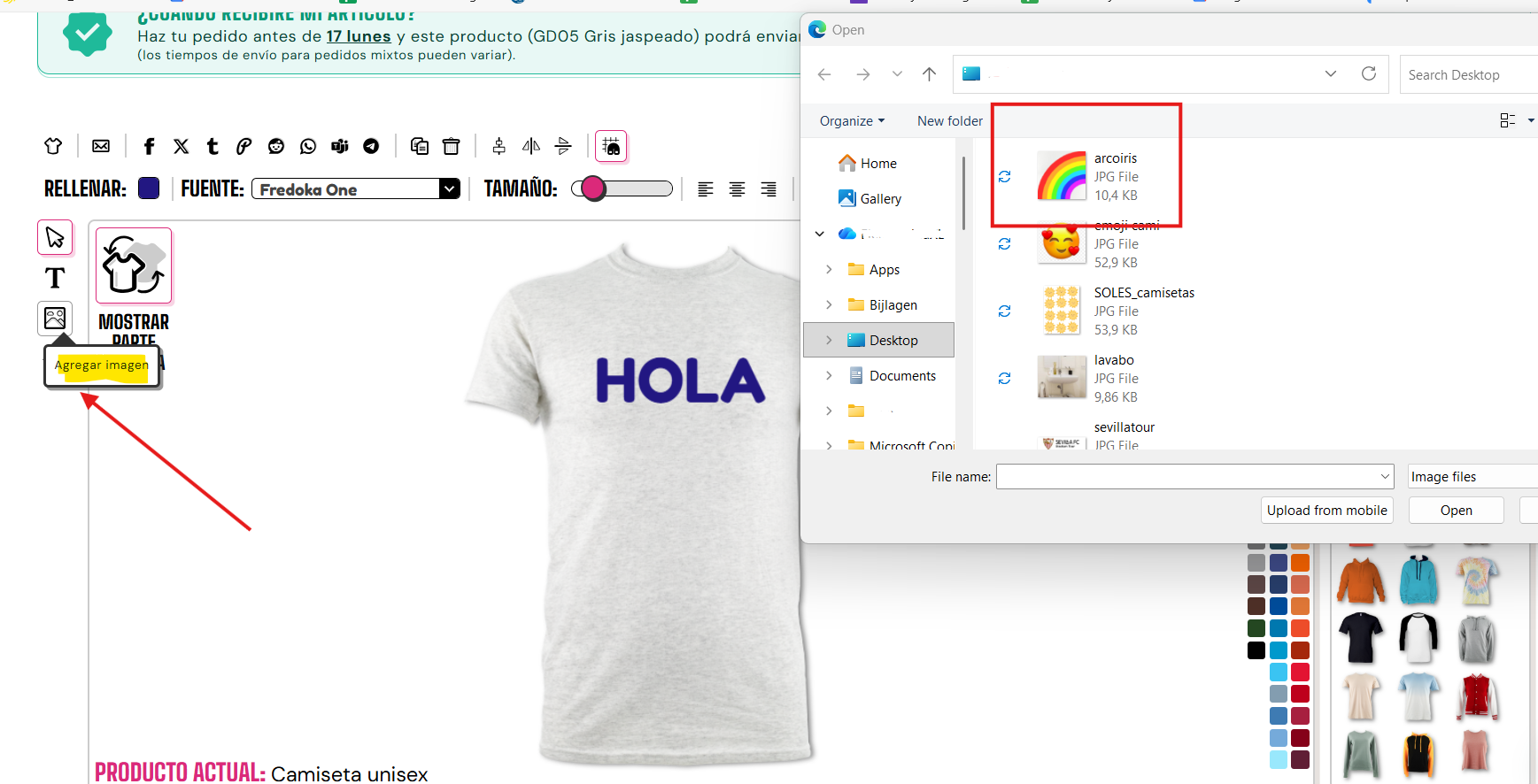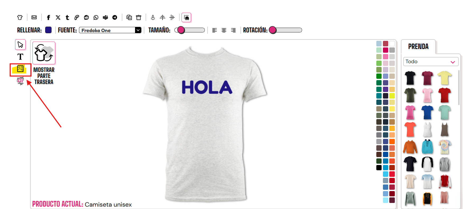 Si quieres añadir imágenes a tu prenda, debes asegurarte de que estén en formato PNG o JPEG y que pesen menos de 20 MB. Una vez que estés listo para subirlas, debes hacer clic en el botón de añadir imágenes. (en este botón aparece colinas y nubes y se encuentra justo debajo de la "T" en el lado izquierdo del diseñador)