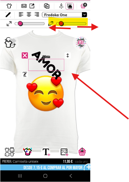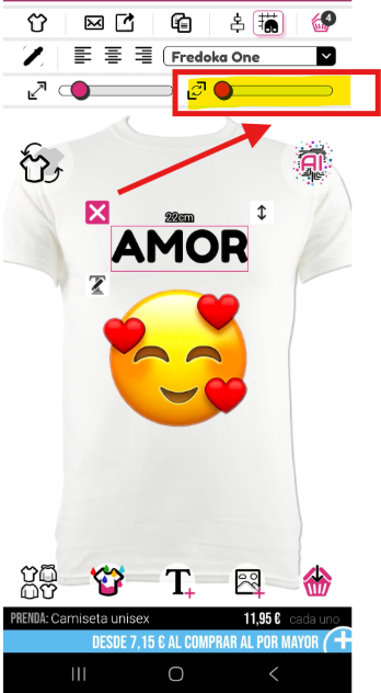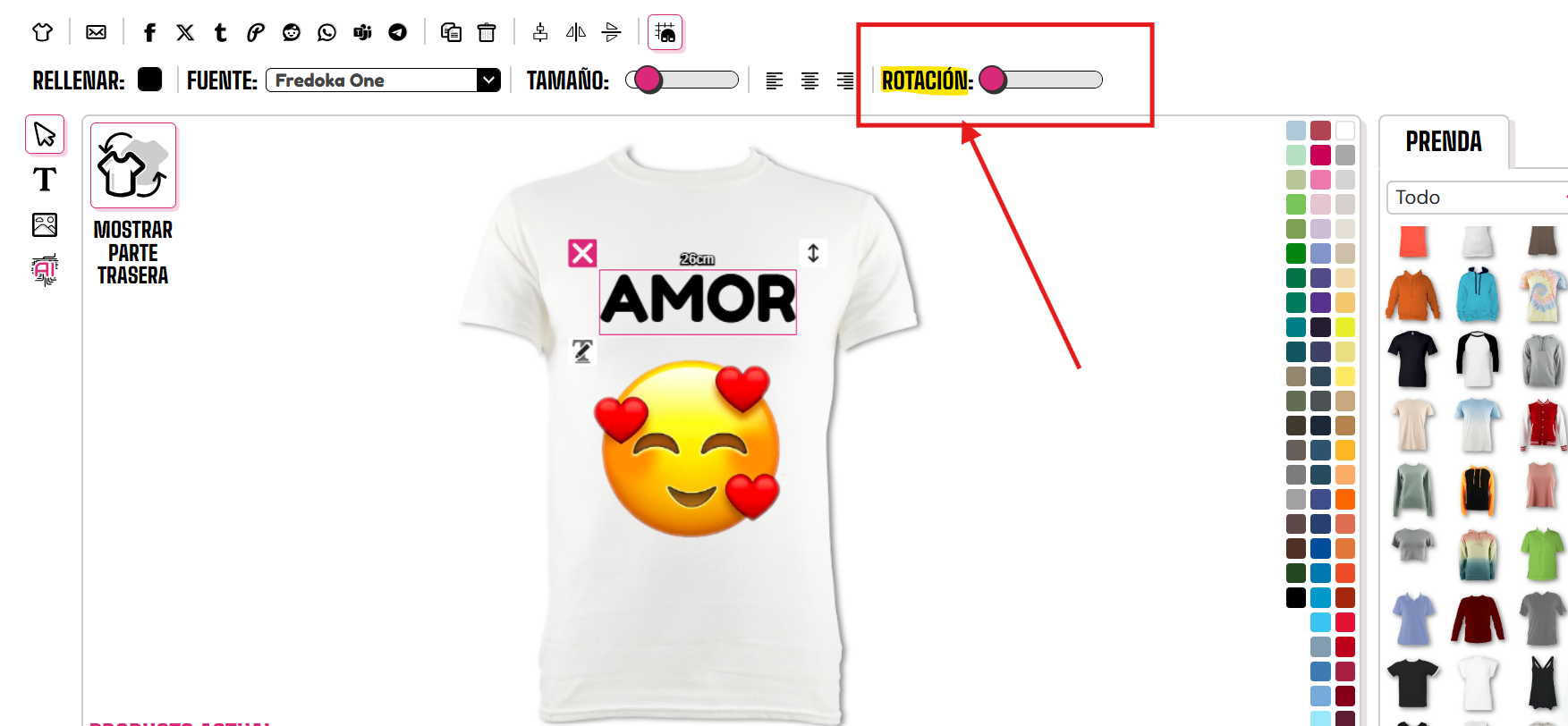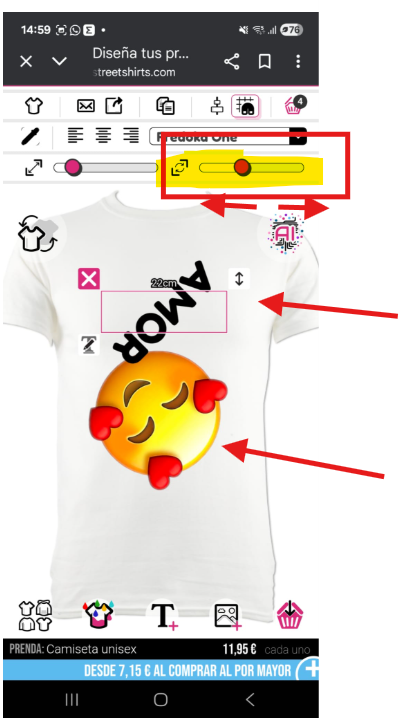Para rotar una imagen o texto, necesitarás usar tu dedo y deslizar la barra de rotación en la parte superior derecha del diseñador.