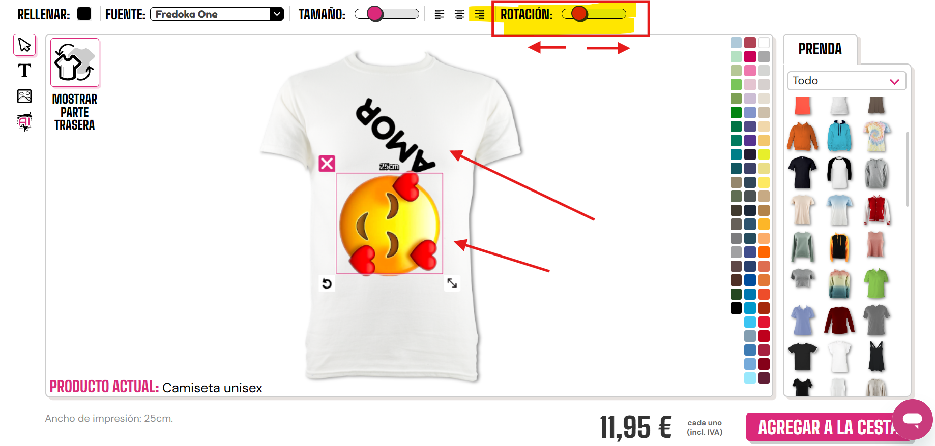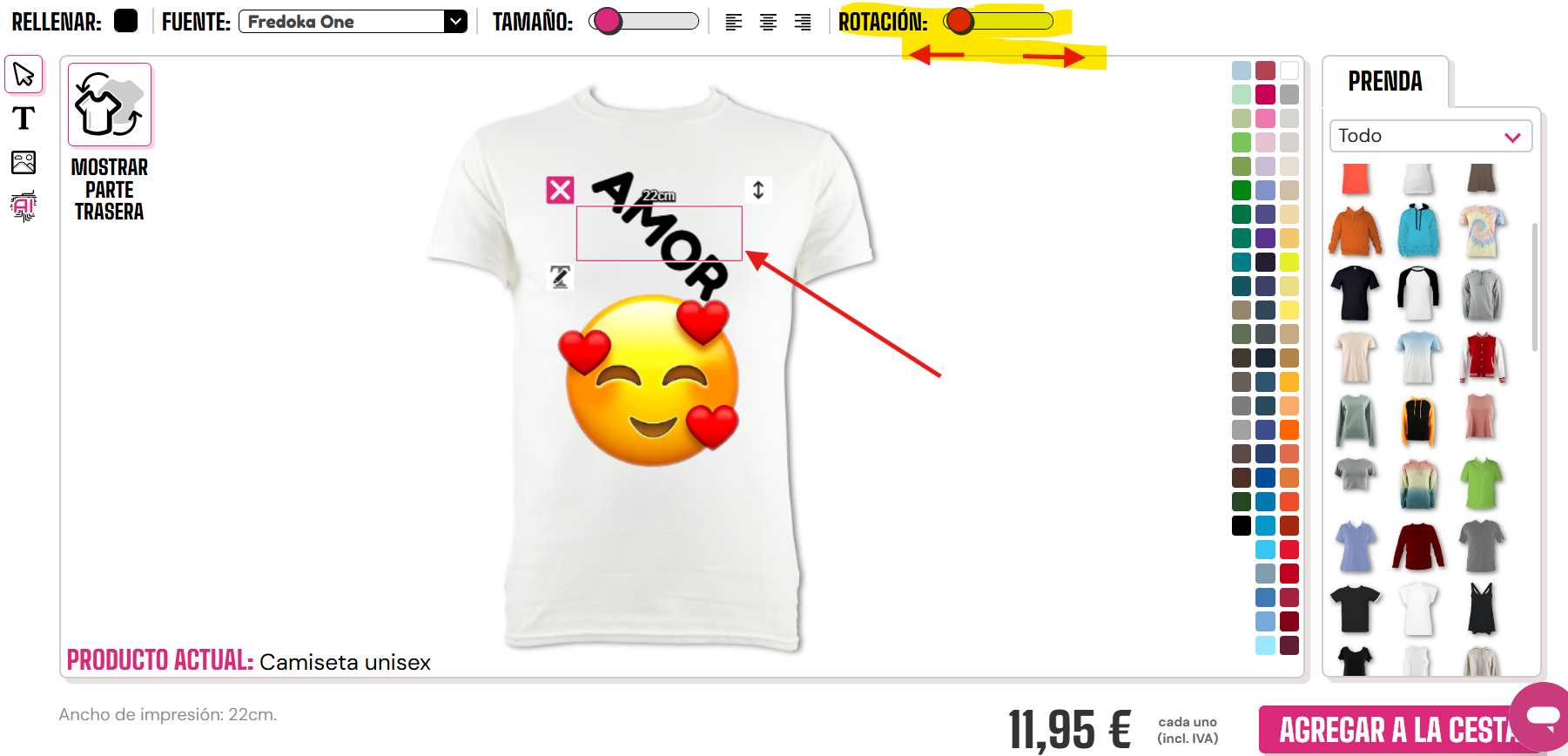 Para rotar una imagen o texto, necesitarás usar el ratón y la barra deslizante en la parte superior derecha del diseñador.