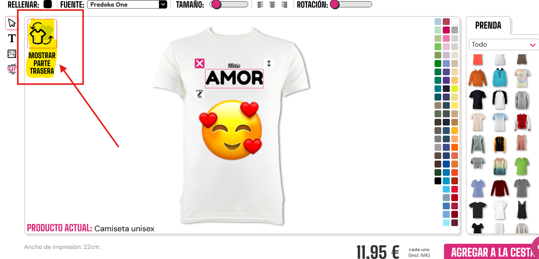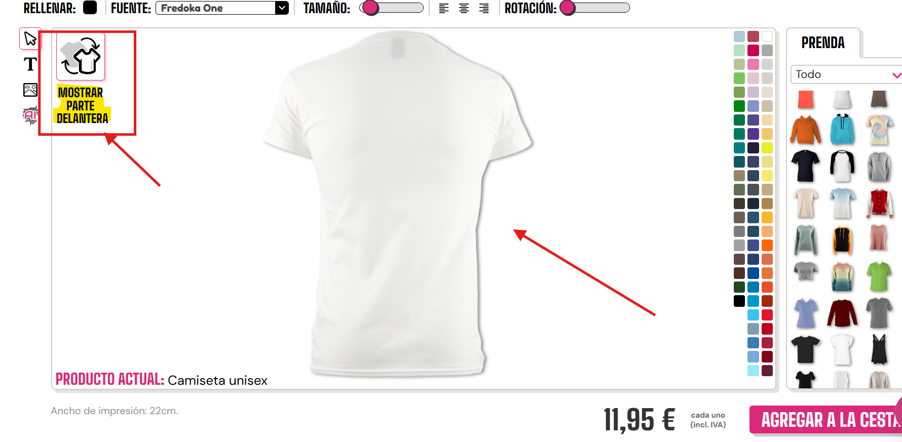Para girar tu camiseta, necesitarás hacer clic en "MOSTRAR PARTE TRASERA" ubicado en la parte superior izquierda del diseñador.