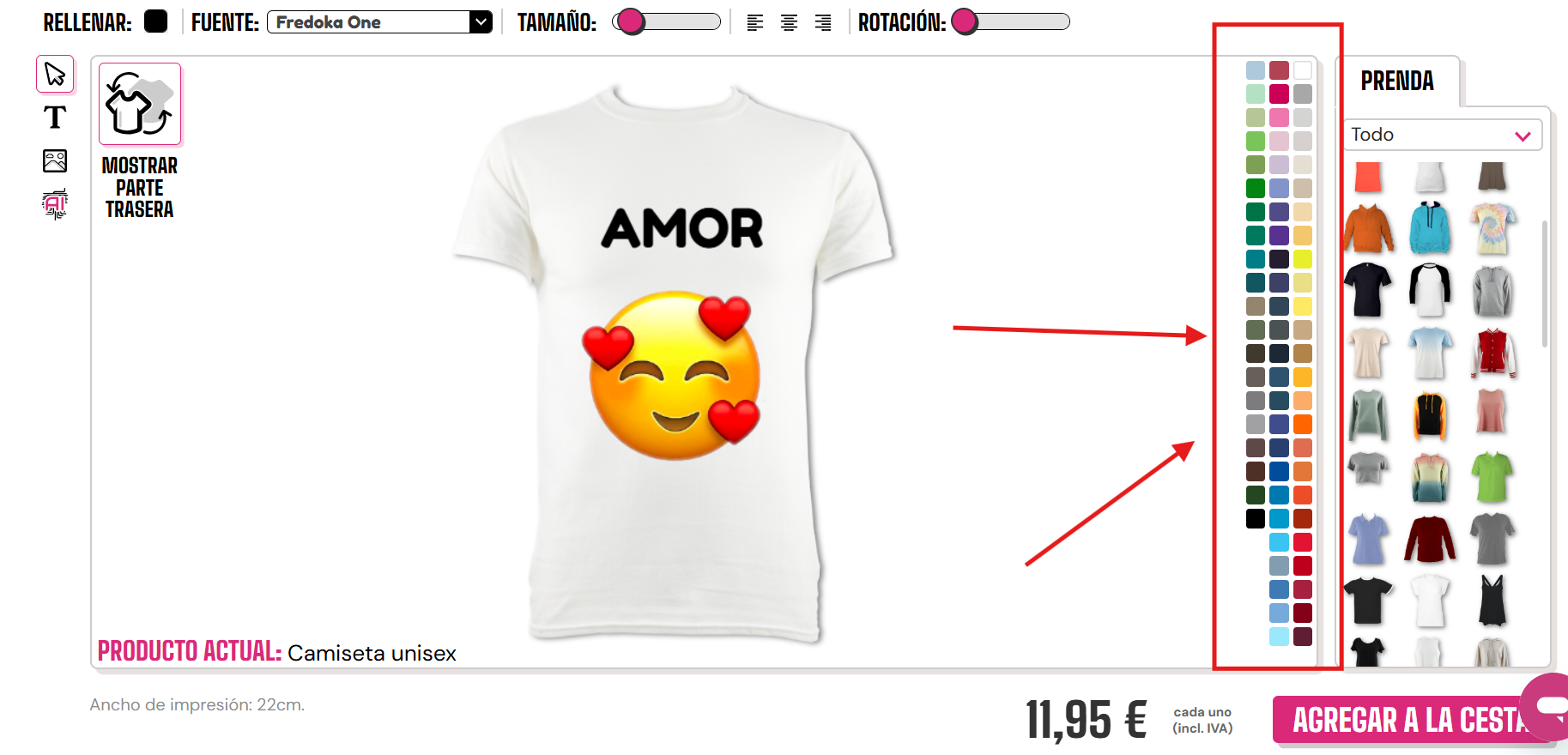 Para cambiar el color de tu prenda, necesitarás seleccionar una de las opciones de color ubicadas en el lado derecho aquí:
