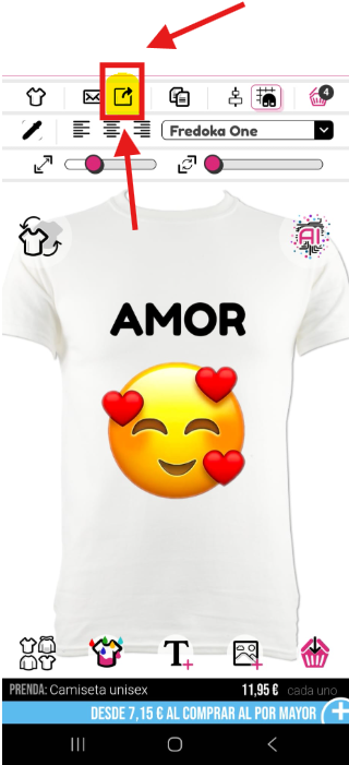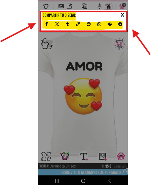Para subir tus diseños a las redes sociales, necesitarás hacer clic en el botón de compartir (mostrado con la flecha abajo) y luego seleccionar la plataforma a la que deseas compartir.