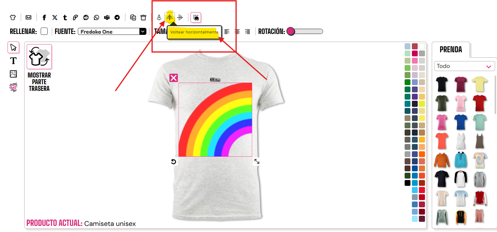 Para voltear tus imágenes ya sea horizontal o verticalmente, necesitarás seleccionar los botones correspondientes. Si pasas el ratón por encima, se mostrará cuál es cuál.