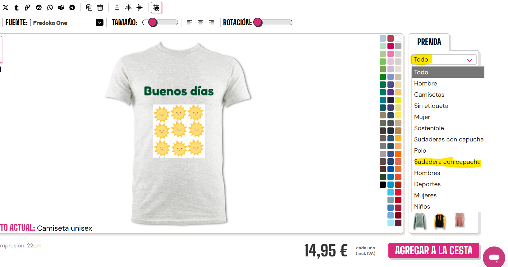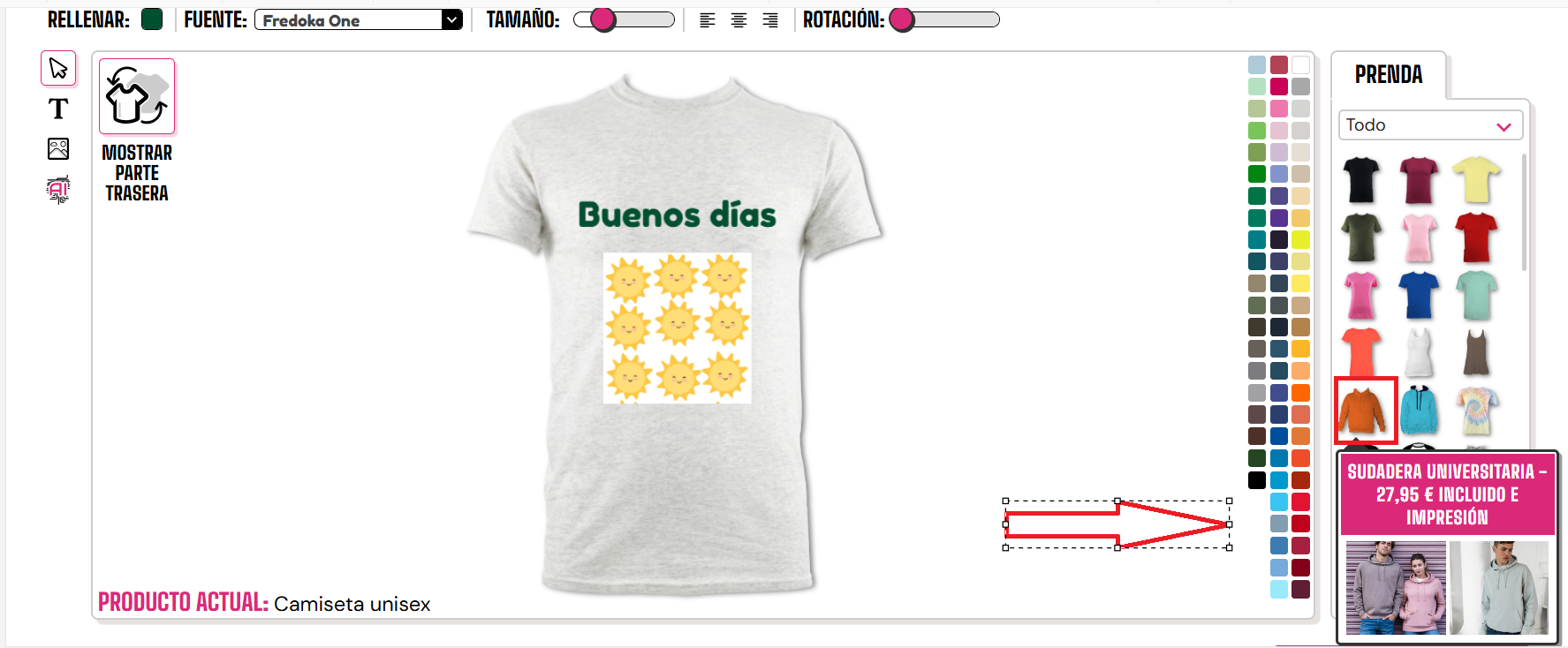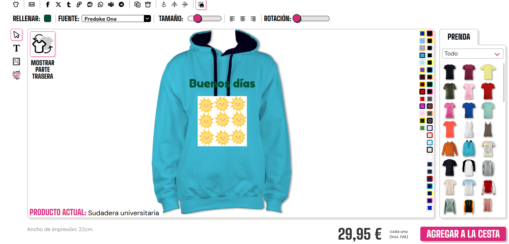 Cuando pases el ratón por encima, se mostrará el nombre de la prenda y el precio de impresión por un solo lado.