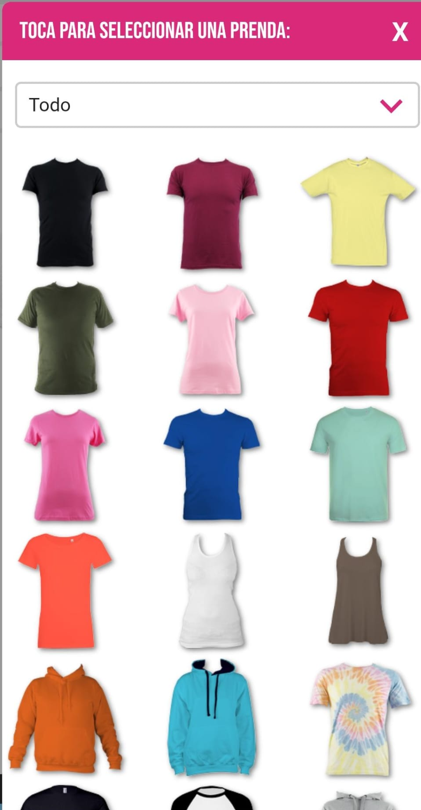 Para elegir tu prenda, puedes seleccionar la que prefieras haciendo clic en una de las opciones de prendas en el lado derecho.