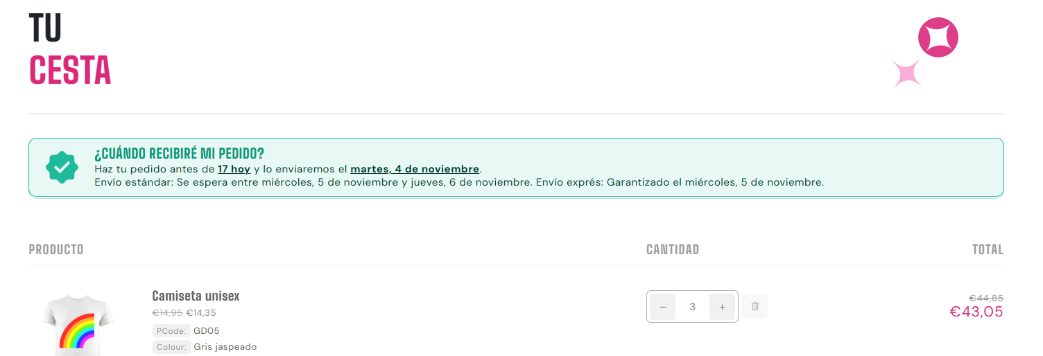Si necesitas tus camisetas muy rápido, elige el envío exprés para asegurarnos de que llegue a tiempo. Una vez que hayas seleccionado esto, se te mostrará un desglose de la entrega que has elegido, incluyendo los precios de este servicio. Has cambiado exitosamente tu método de entrega.