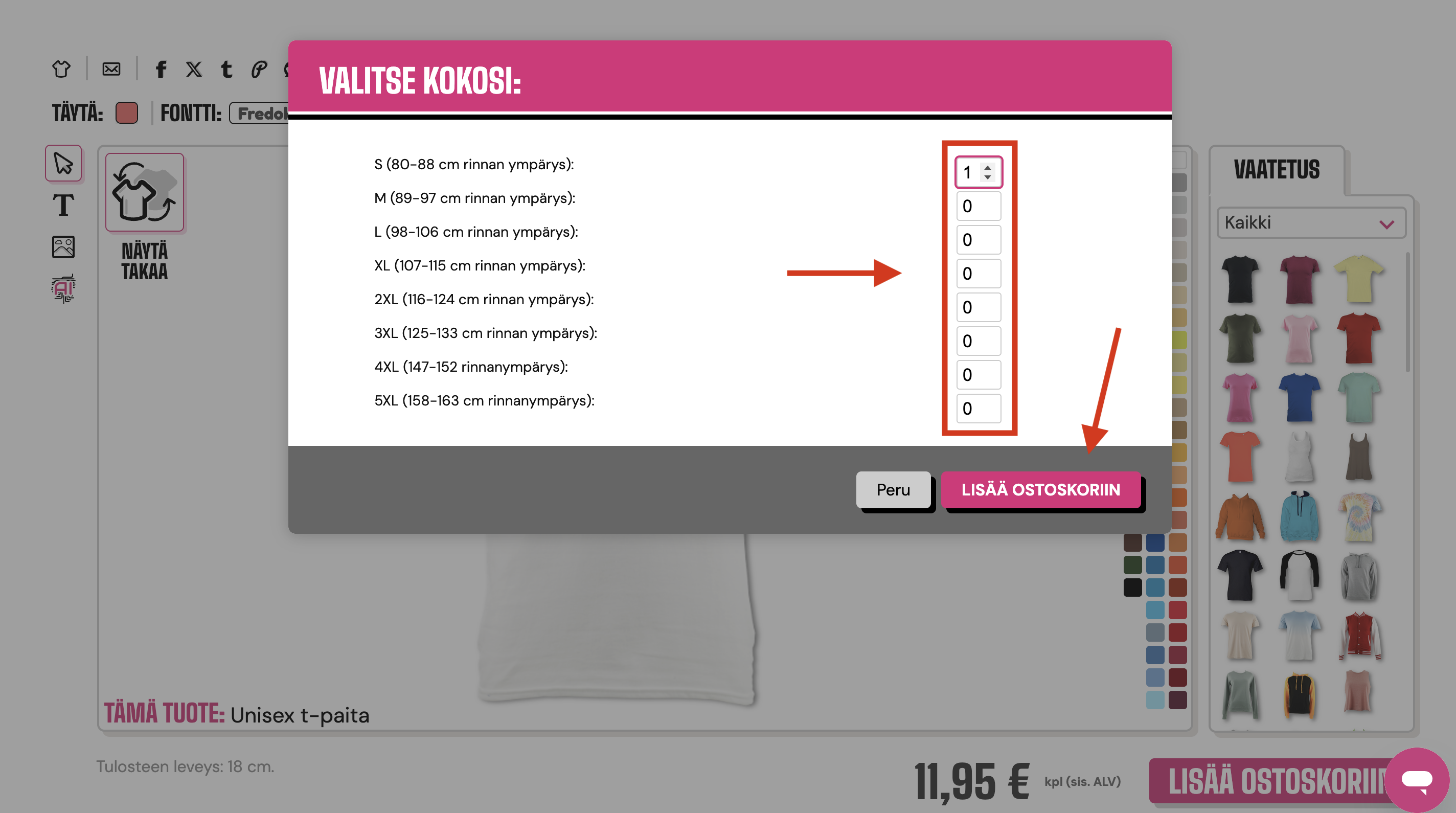 Valitse haluamasi koko syöttämällä tarvittava määrä