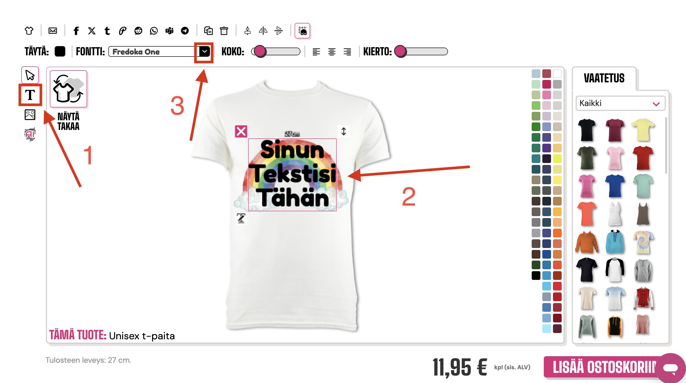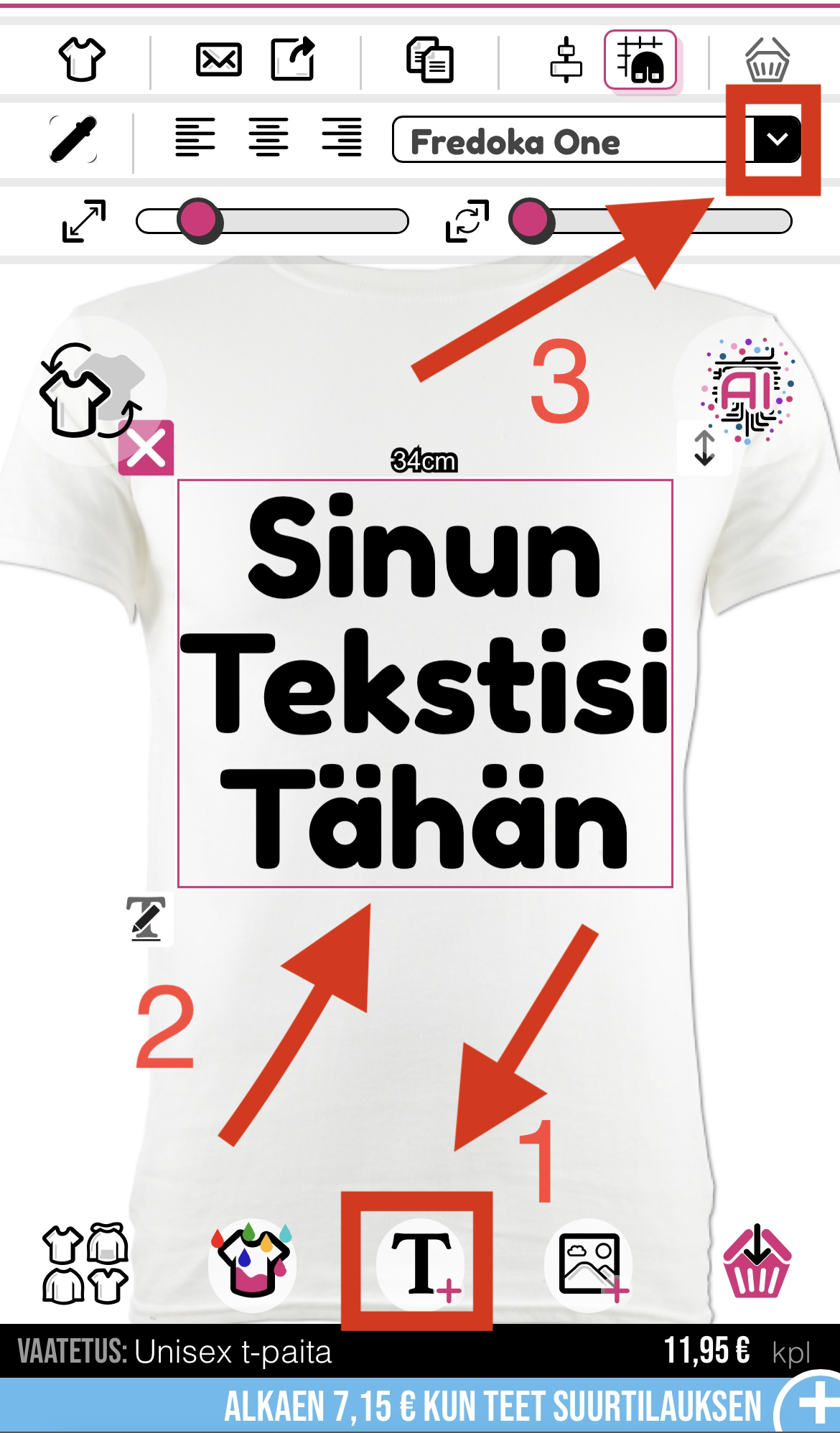 Valitaksesi fonttityylin, sinun tulee klikata suunnittelijan vasemmalla puolella olevaa "T"-painiketta tuodaksesi tekstin esiin, jos et ole jo tehnyt niin, ja sitten klikata tätä tekstiä korostaaksesi laatikon. Tämän jälkeen sinun tulee klikata fonttiosion yläosassa olevaa alanuolta. Oletusfontti on "Fredoka One"