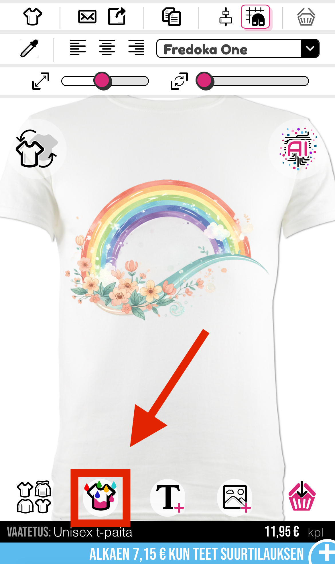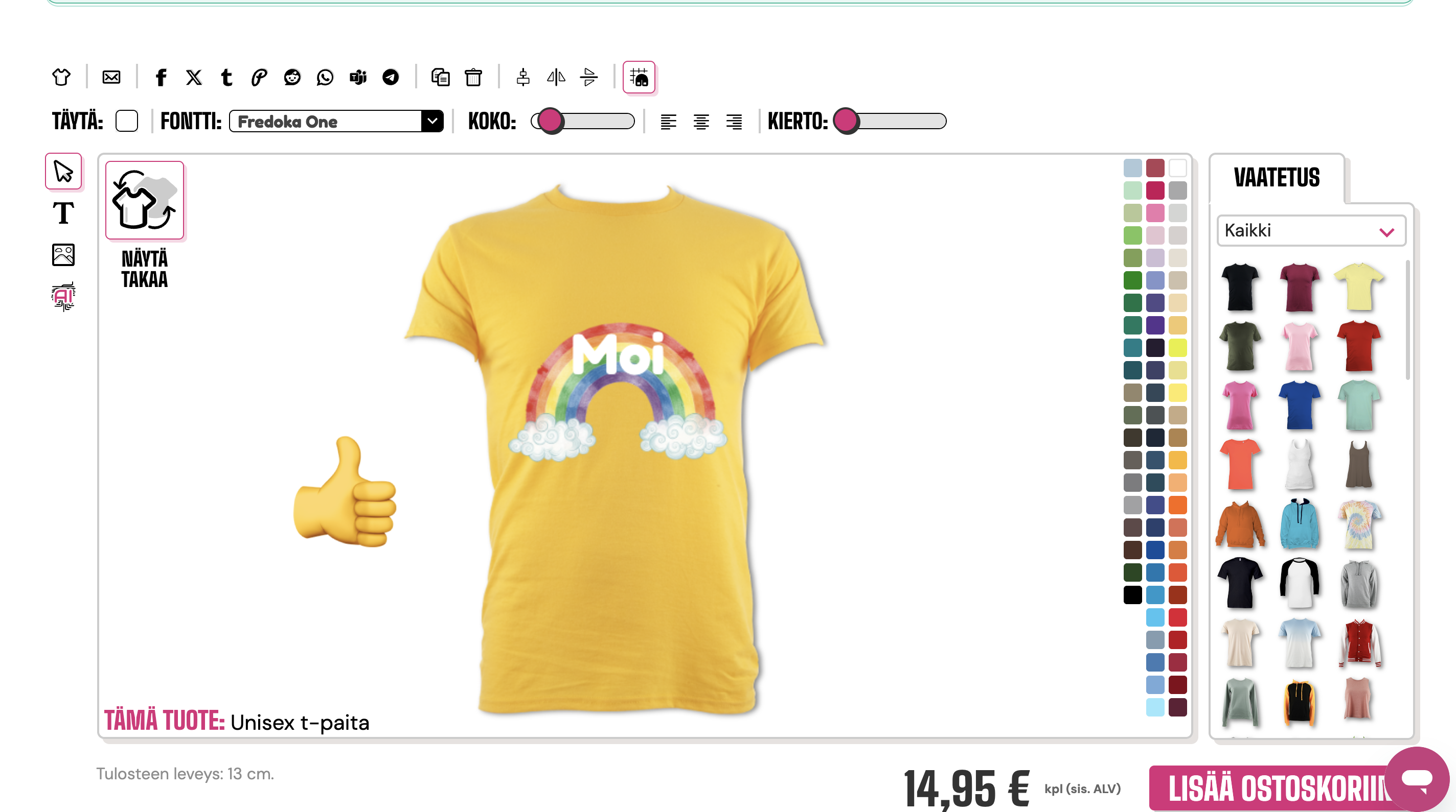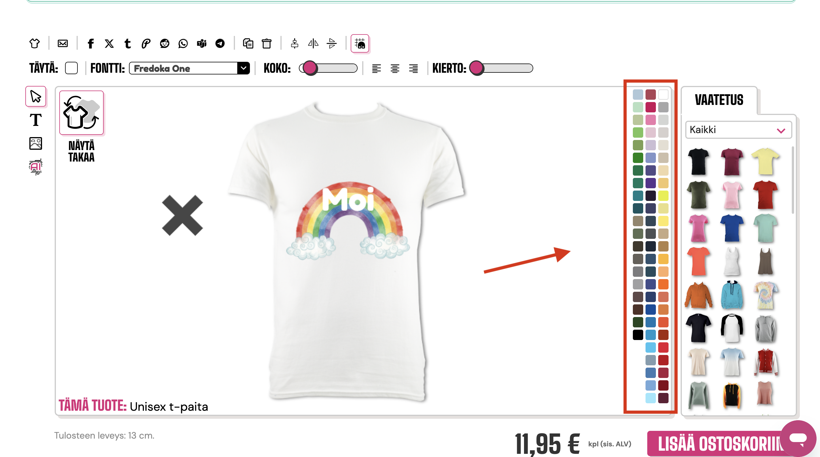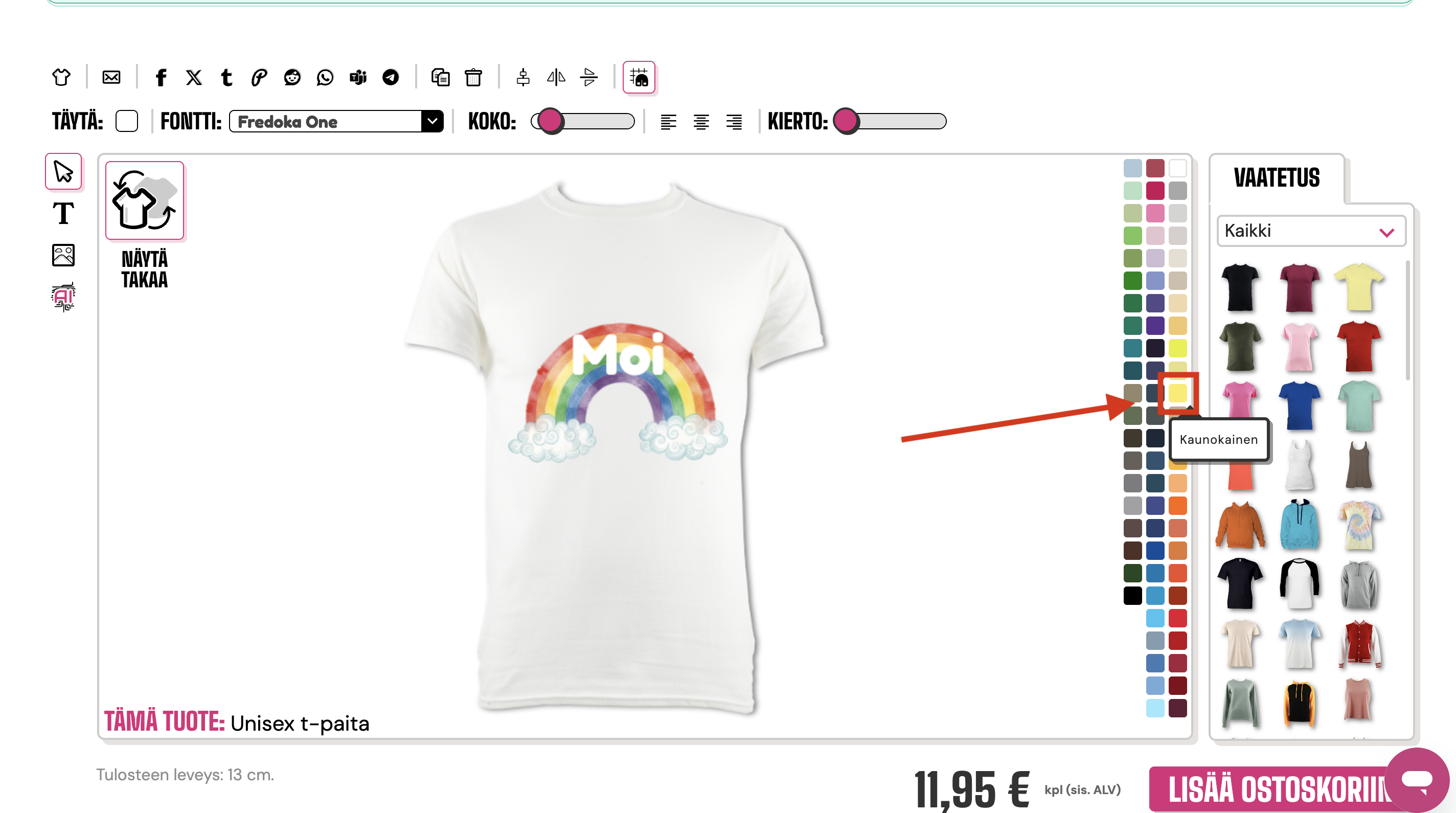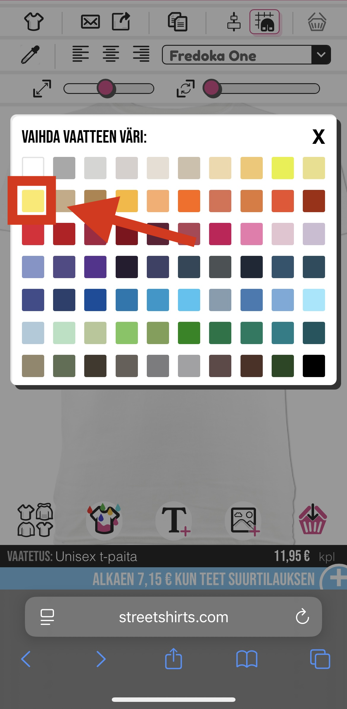 Klikkaa haluamaasi väriä ja t-paitasi väri muuttuu valitsemaksesi väriksi.