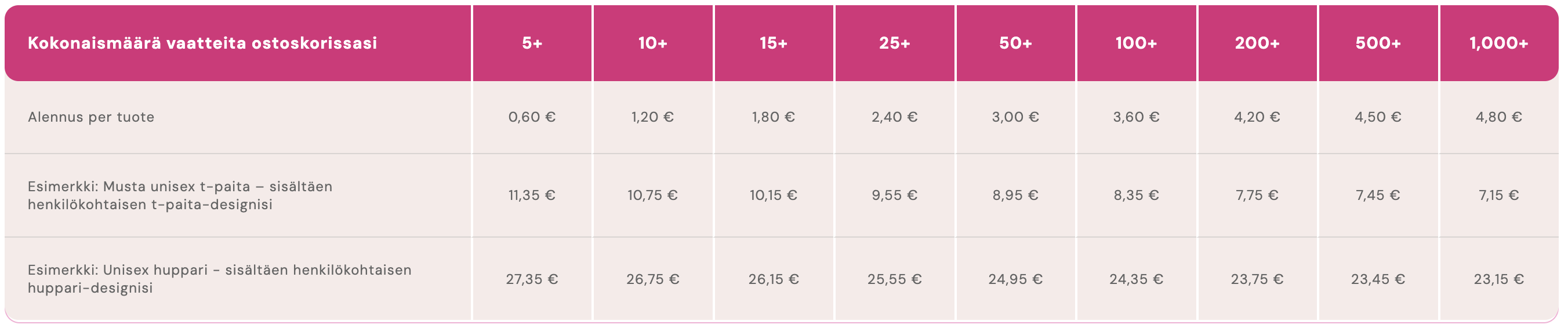 Suurtilausalennukset alkavat jo viidestä tuotteesta ostoskorissasi (nämä voivat olla minkä kokoisia, tyylisiä tai värisiä tahansa). Löydät suurtilausalennustaulukon suunnittelijan alta, kun luot ja ostat t-paitoja.