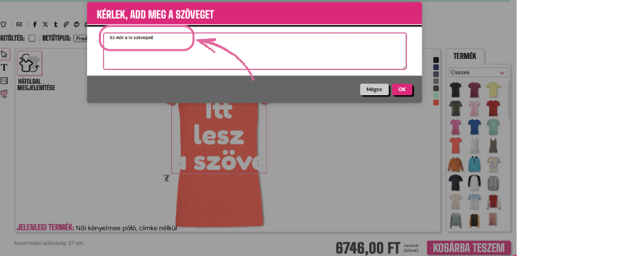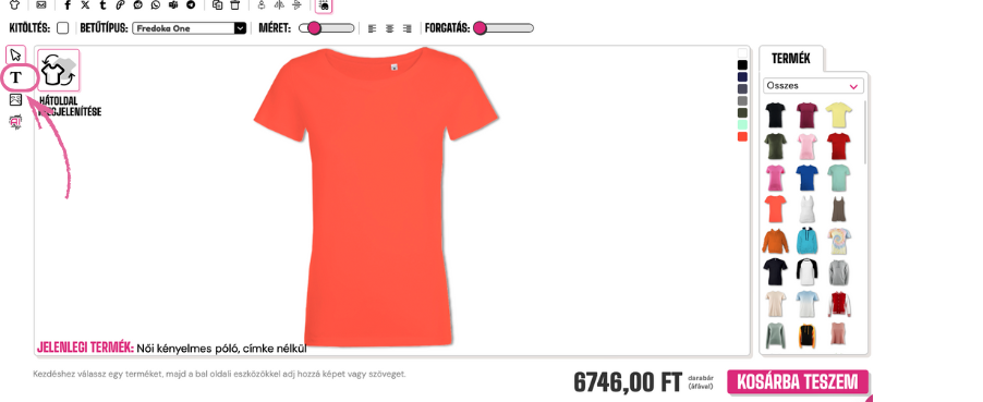Ha szöveget szeretnél hozzáadni a ruhadarabhoz, kattints a tervező bal oldalán található "T" szimbólumra.