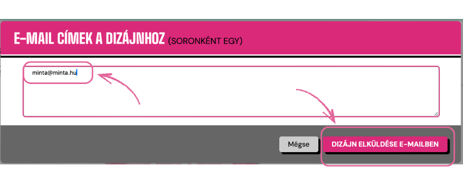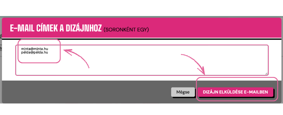 Elküldheted magadnak vagy akár egy barátodnak is e-mailben, hogy megvásárolhassa. Írd be az e-mail címet, amelyre el szeretnéd menteni/küldeni, majd kattints az "dizájn elküldése emailben" gombra.