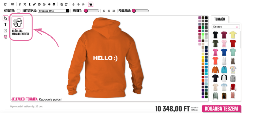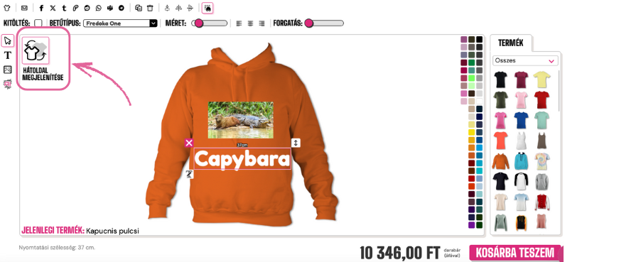 Ahhoz, hogy megfordítsd a pólódat, kattints a tervező bal felső sarkában található "HÁTOLDAL MEGMUTATÁSA" gombra.