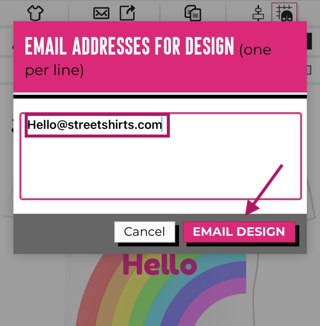 Du kanns däin Design entweder un dech selwer oder un eng aner Persoun mailen. Gëff einfach déi E-Mail-Adress an, un déi s du däin Design wëlls schécken, a klick op „EMAIL DESIGN“.