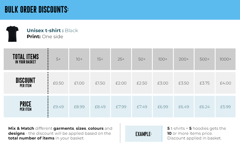 D’Remise fänke scho bei nëmme 5 Artikelen an Ärem Akafskuerf un, egal wéi eng Gréisst, Stil oder Faarf Dir auswielt. Dir fannt en Tableau mat eise Groussbestellungs-Remisen ënnert dem Designer op der Säit „T-Shirten erstellen a kafen“: