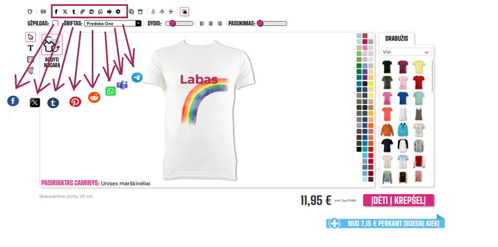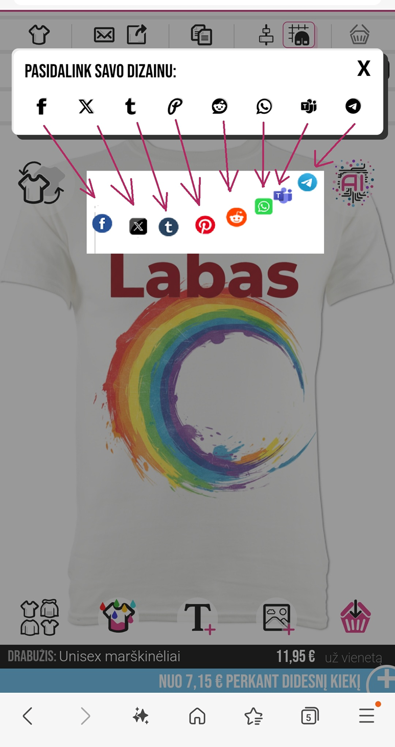 Norėdami įkelti savo dizainus į socialinius tinklus, turėsite spustelėti platformą, į kurią norite dalintis.