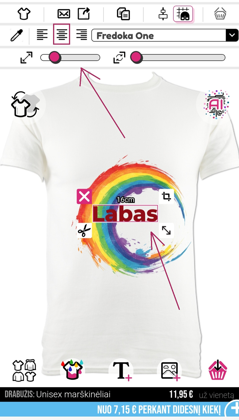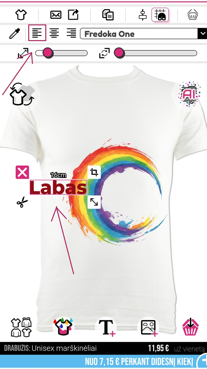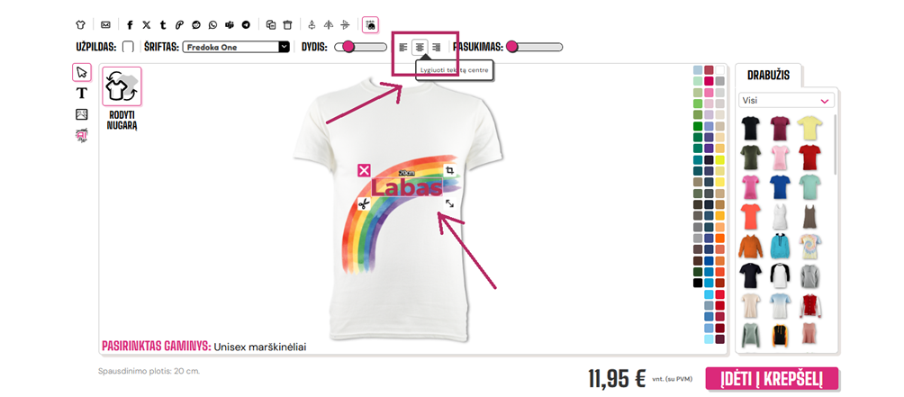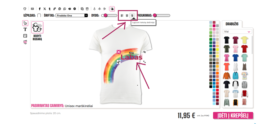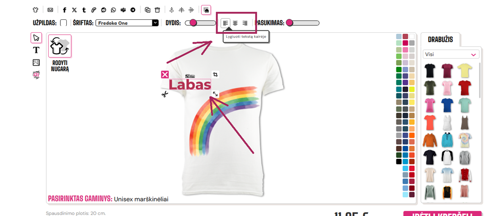 Norėdami sulygiuoti tekstą į kairę/centrą/dešinę, turėsite spustelėti atitinkamą mygtuką.