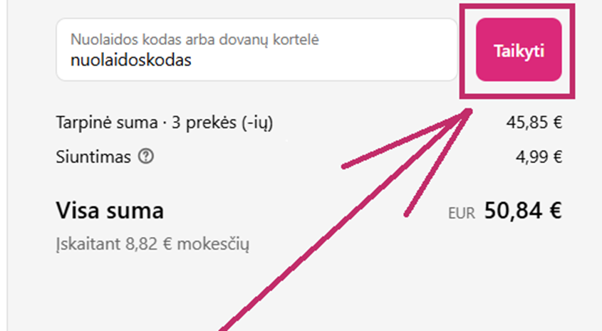 Įvedę kupono kodą, spustelėkite "Taikyti".
