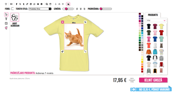 - Lai nodrošinātu, ka mēs piegādājam kreklus, kas atbilst priekšskatījumiem, un lai mēs varētu piegādāt tieši tādu pašu preci, ja jūs pasūtīsiet to vēlreiz pēc diviem gadiem, veidojot kreklu mūsu lapā, visi izmēri tiek aprēķināti automātiski. Šo failu mūsu iekārtas nodrukā tieši tādu, kāds tas ir. Mēs nesen atjauninājām mūsu dizaina programmatūru, lai pirms pasūtīšanas parādītu izmēru centimetros. Tas tiek parādīts virs jūsu attēla vai teksta un dizaine rīka apakšējā kreisajā stūrī. Parādītais izmērs ir augšupielādētā attēla izmērs, tāpēc, ja jūsu attēlam ir lielas caurspīdīgas zonas, kas netiek drukātas, jūs varat redzēt drukas izmēru, uzzīmējot lodziņu redzamās zonas izmērā (skatīt ekrānuzņēmumu zemāk).
