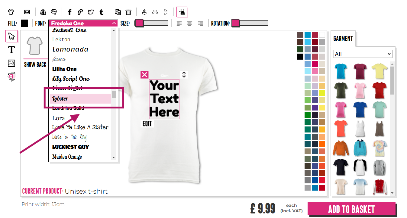 Lai izvēlētos fonta stilu, jums būs jānoklikšķina uz "T" dizainera kreisajā pusē, lai parādītu tekstu, ja tas vēl nav izdarīts, un pēc tam jānoklikšķina uz šī teksta, lai izceltu lodziņu. Tad jums būs jānoklikšķina uz lejupvērstās bultiņas fonta sadaļā, kas atrodas dizainera augšpusē. Noklusējuma fonts ir "Fredoka One"
