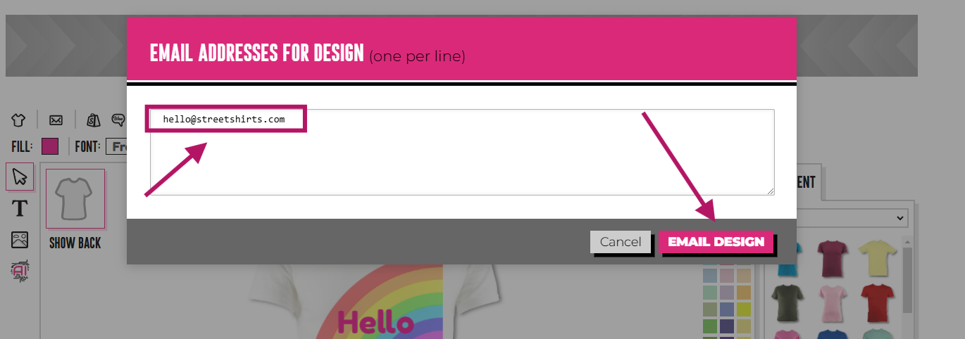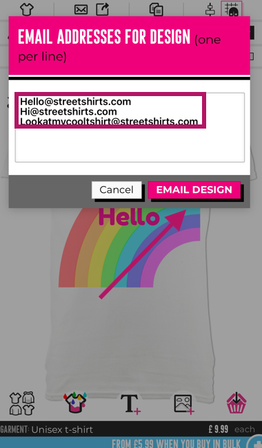 Jūs varat nosūtīt to sev vai pat draugam, lai iegādātos. Ievadiet e-pasta adresi, uz kuru vēlaties saglabāt/nosūtīt, un noklikšķiniet uz "EMAIL DESIGN"
